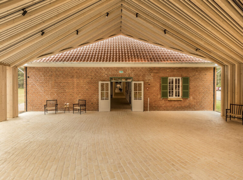 Hvor den nye bygnings lukkede facade bevidst skulle være utilnærmelig, var det samtidig et ønske med det nye museum om det alvorlige emne, at indretningen skulle bringe håb. Derfor er der store vinduer, der giver masser af dagslys, og materialerne er valgt, så de giver en venlig atmosfære. Der er anvendt fyrretræ til både konstruktioner og beklædning, og på gulvene ligger gule teglsten, der er inspireret af de oprindelige gulve i gangarealerne i de gamle længer. I dag binder teglgulvene både fysisk og visuelt det gamle og det nye sammen, fordi gulvene er lagt i forbandt uden afbrydelse gennem hele anlægget. At lægge de omkring 80.000 teglsten præcist igennem nybygningens slyngede form har krævet tid og tålmodighed. Under teglgulvet er der etableret gulvvarme, der forsynes via et jordvarmeanlæg under græsplænen udenfor. De holdbare materialer giver også en lettere daglig drift, og så bliver de smukkere, efterhånden som de får slid og patina.