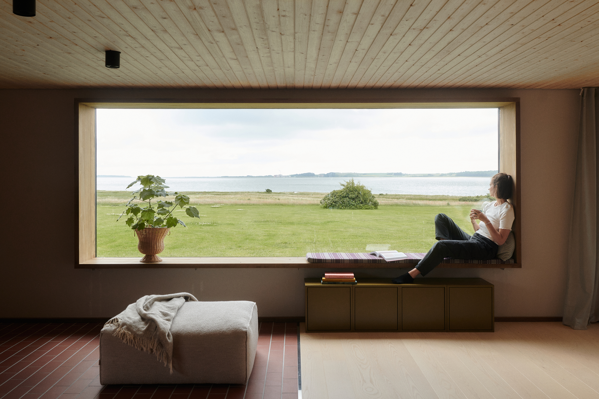 Huset ligger mod fjorden, men udnyttelsen af udsigten var ikke optimal, vi drømte om at få naturen med helt ind i stuen. Problemet var at der i eksisterende plantegning lå værelser og bærende vægge mod huset, så løsningen skulle udarbejdes grundigt af arkitekten og ingeniører. Løsningen blev at vælte væggene mod at åbne rummet, som blev køkken/alrum, tilføje et 12kvm stort rektangulært vindue mod fjorden med bænk indbygget. Derudover lavede Nordpil arkitekter en udbygning / overdækket terrasse, som skulle forlænge huset og dets muligheder for brug af den omkringliggende natur.