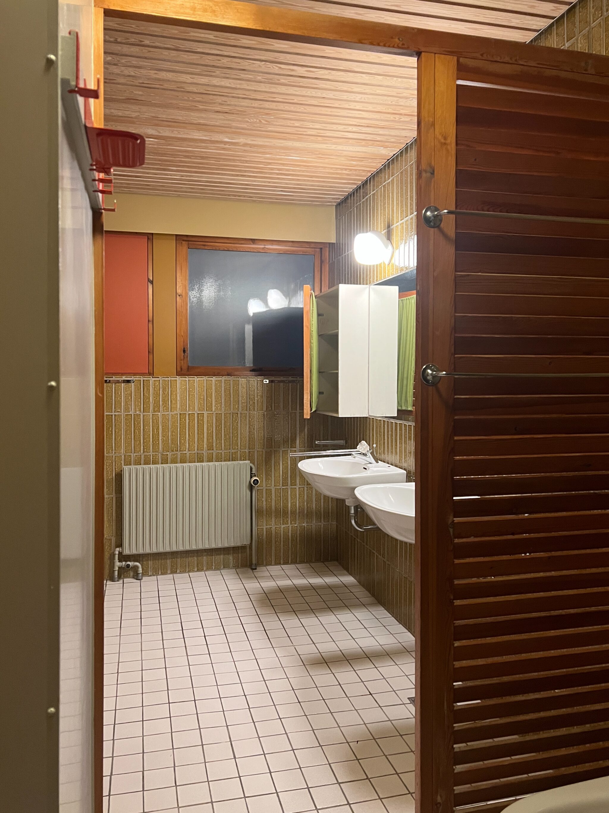 Renoveringen startede på badeværelset, hvor de grønne Höganæs fliser gik fra gulv til loft, de blev nænsomt pillet ned for at kunne udskifte rør bagved og tilføje nye armaturer. Derefter blev de sat tilbage på plads.
