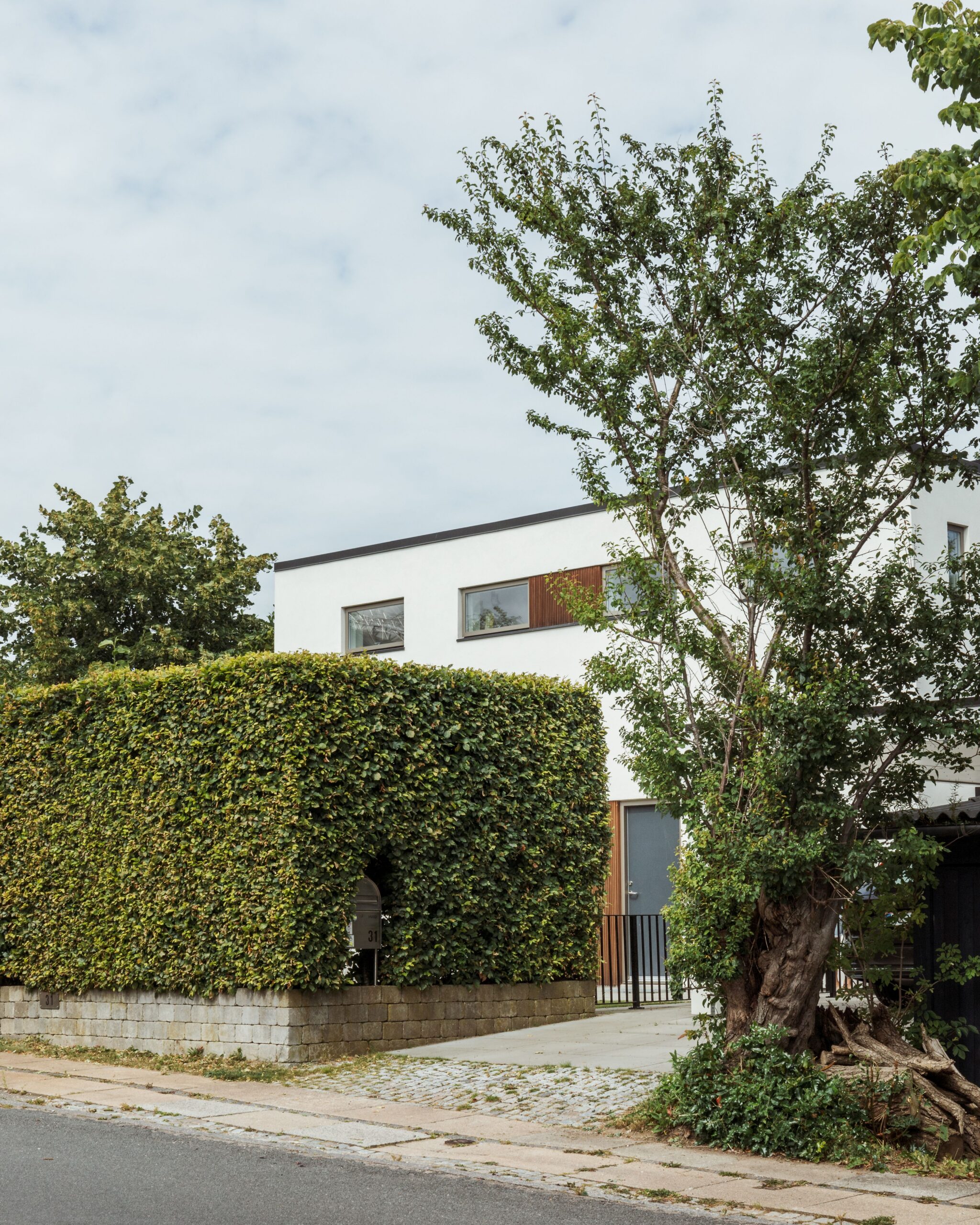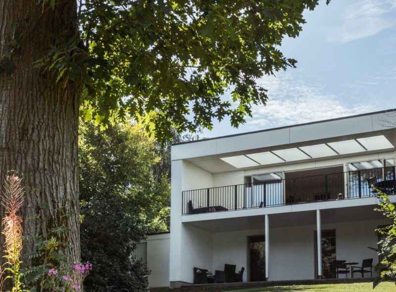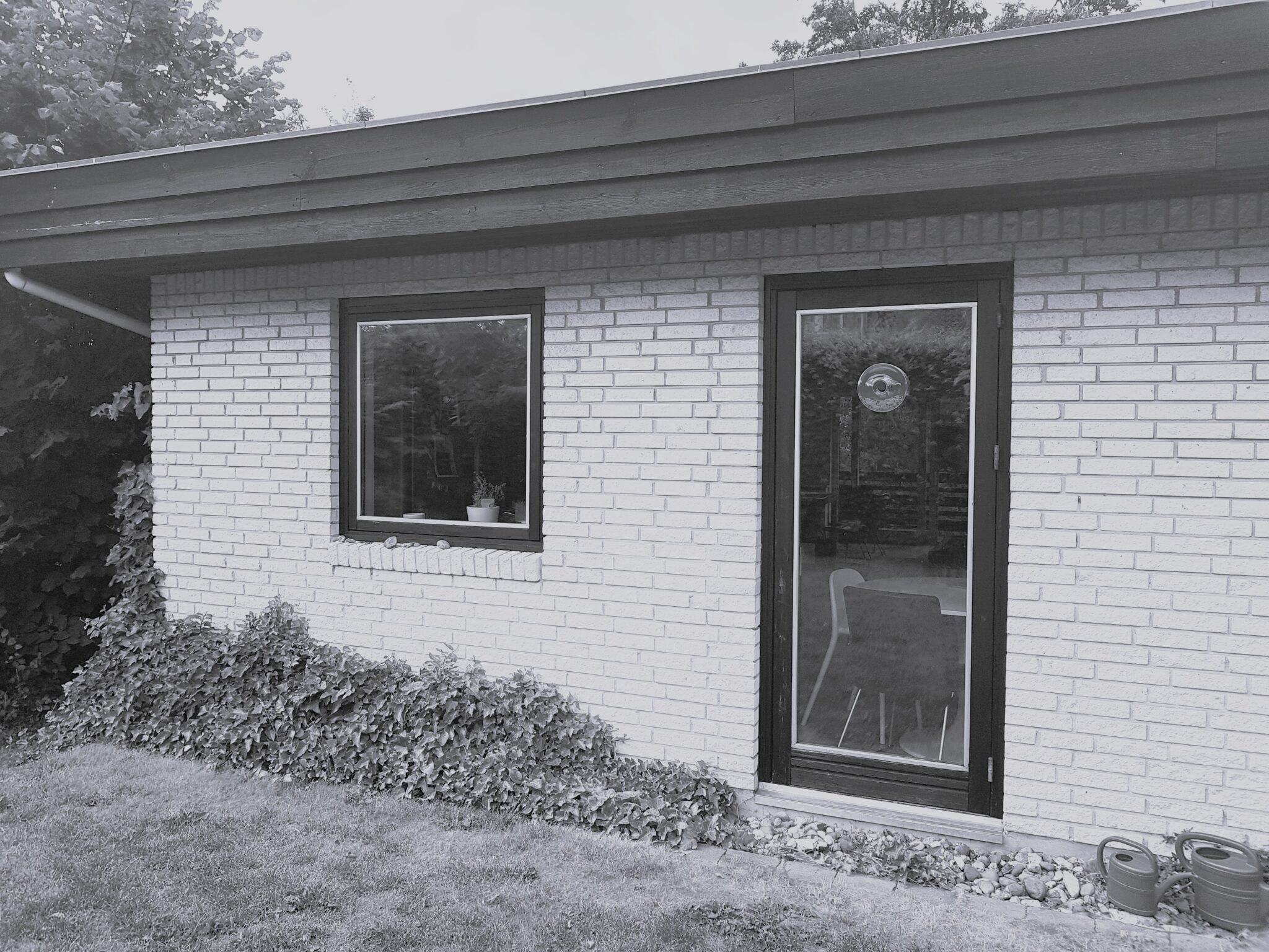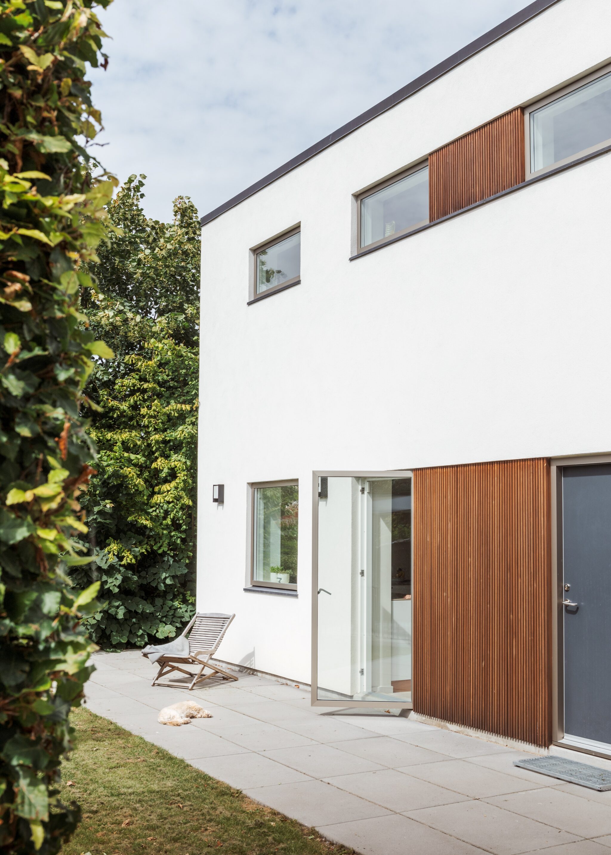 Huset blev efterisoleret og pudset hvidt, og det nye sedumtag giver et flot samspil med skovens farver hele året. De store ovenlysvinduer over trappen og terrassen giver godt dagslys til stueetagen sammen med den nye, dobbelte skydedør. Den kedelige svalegang mod nord blev samtidig genskabt til et skønt uderum, som kan bruges stort set hele året. Det hele med et nyt og mere moderne facadeudtryk.