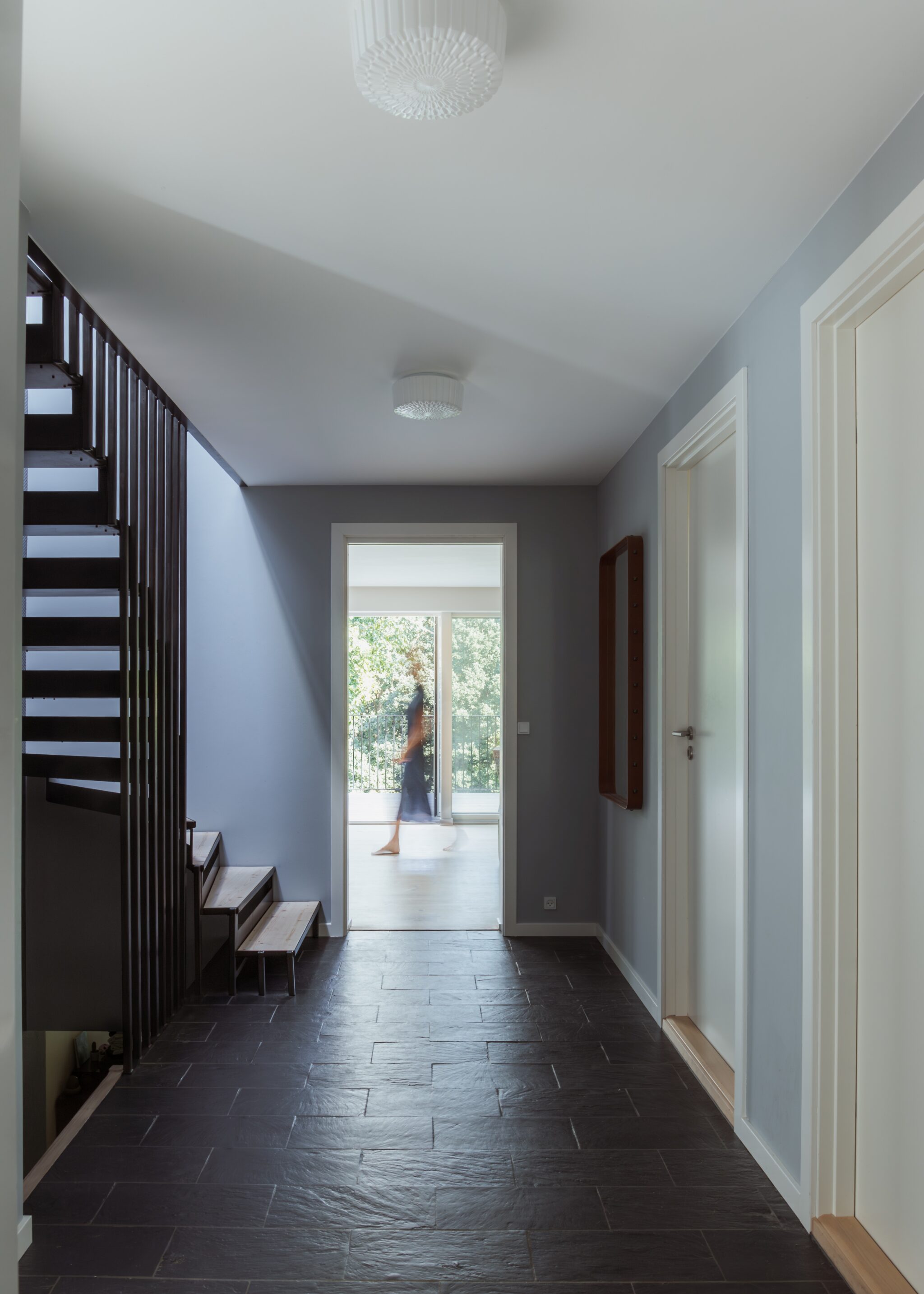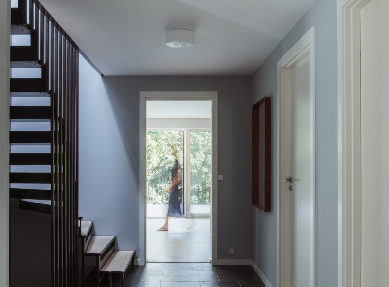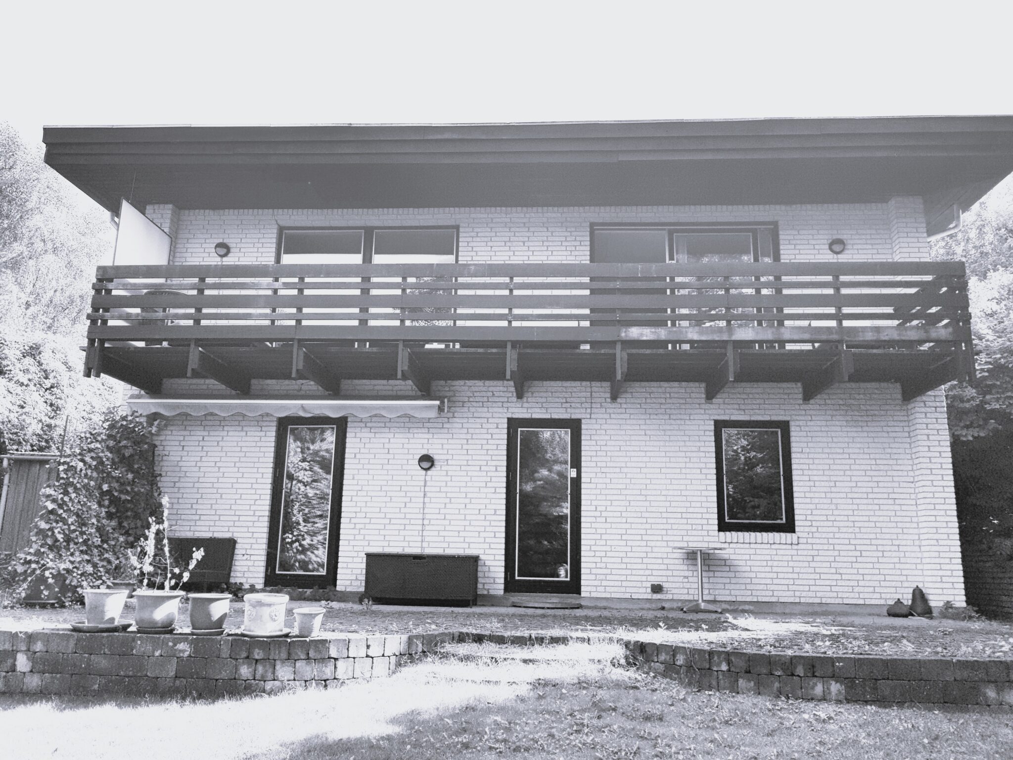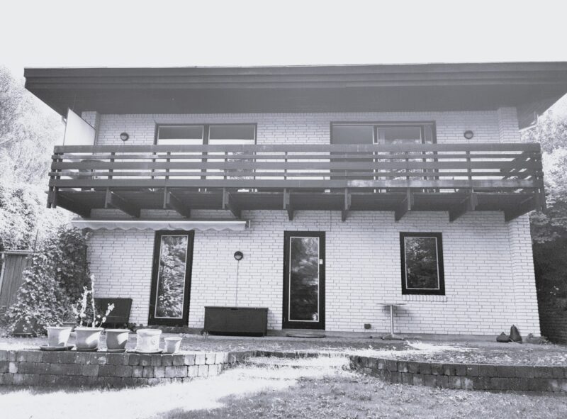 Huset blev efterisoleret og pudset hvidt, og det nye sedumtag giver et flot samspil med skovens farver hele året. De store ovenlysvinduer over trappen og terrassen giver godt dagslys til stueetagen sammen med den nye, dobbelte skydedør. Den kedelige svalegang mod nord blev samtidig genskabt til et skønt uderum, som kan bruges stort set hele året. Det hele med et nyt og mere moderne facadeudtryk.