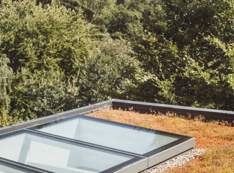 Overetagen er bygget i trækonstruktioner, som har en mindre klimabelastning, og taget er belagt med sedum for at fremme biodiversitet og forsinke regnvandet i at nå kloakken.