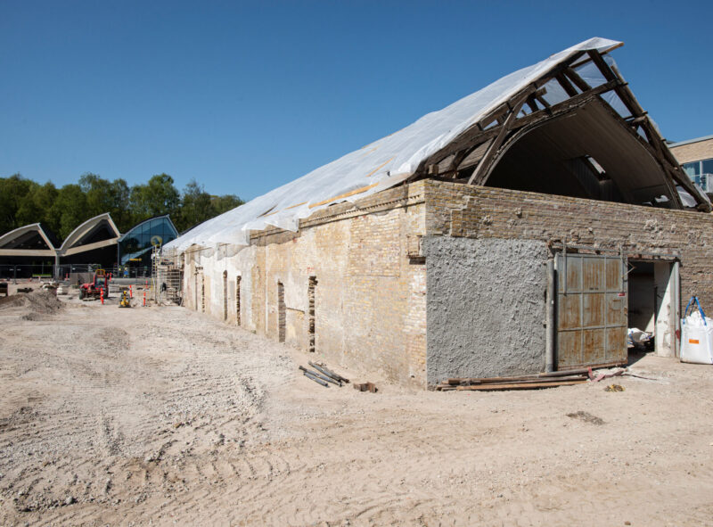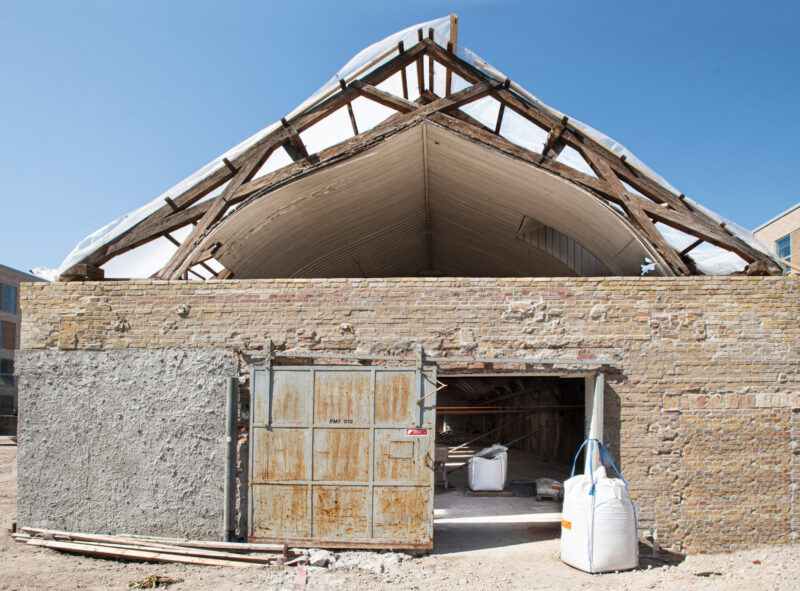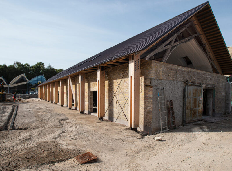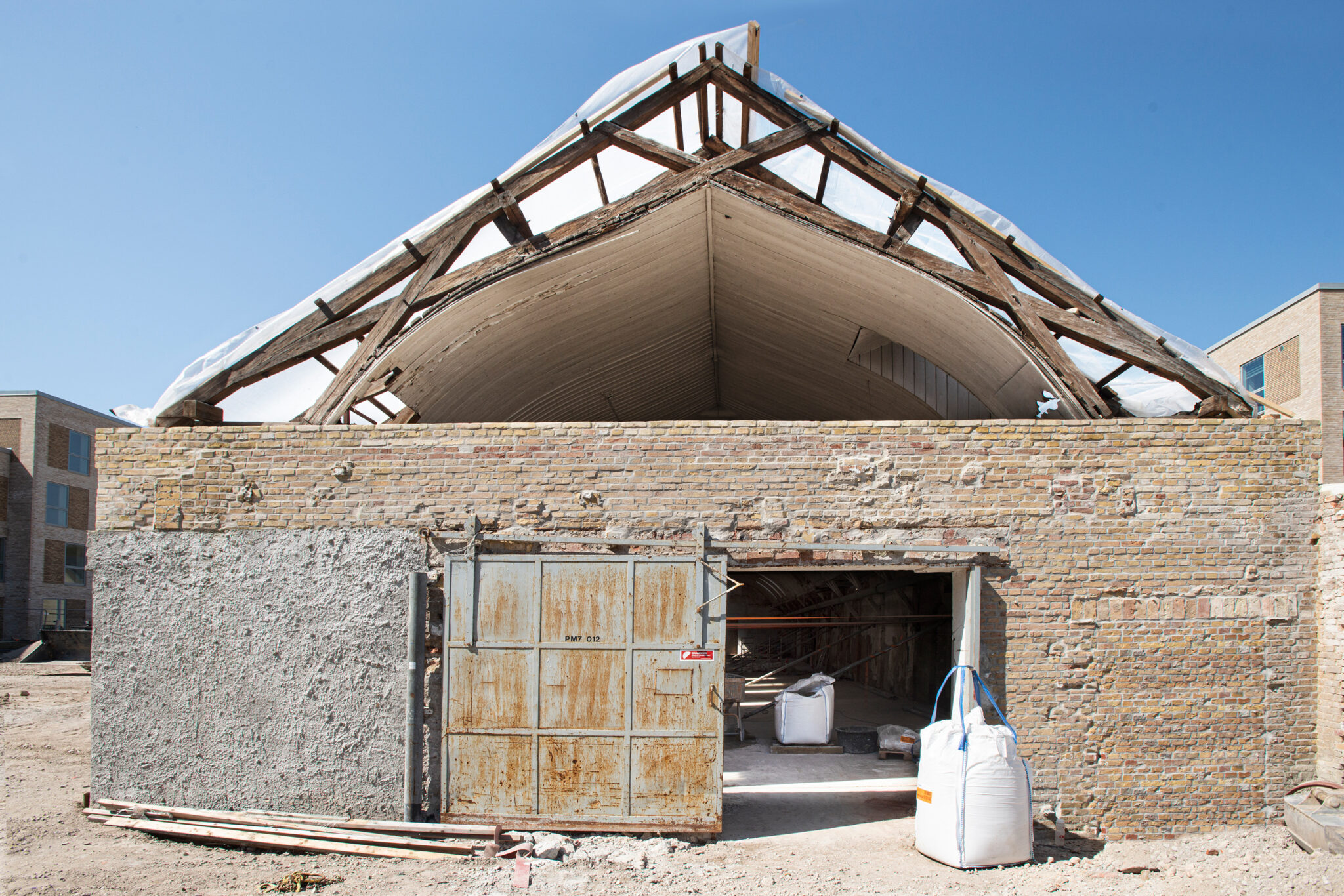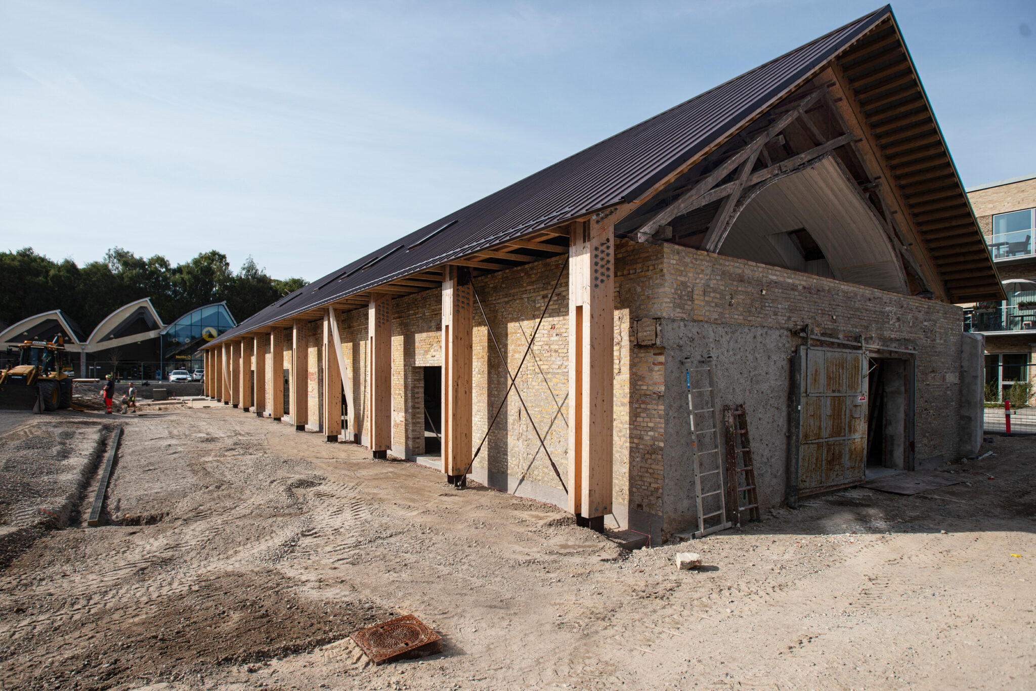 • En ny, fritstående limtræskonstruktion er placeret uden på den eksisterende bygning. Konstruktionen stabiliserer de oprindelige vægge og bærer et nyt tag, men uden at efterligne eller skjule det historiske udtryk.