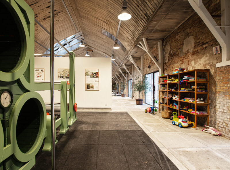 • For børn er der etableret en indendørs legeplads formet som en papirmaskine, der både fungerer som leg, identitetsskabende element og formidling af stedets historie.