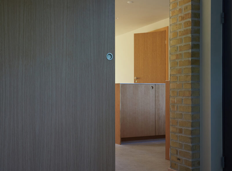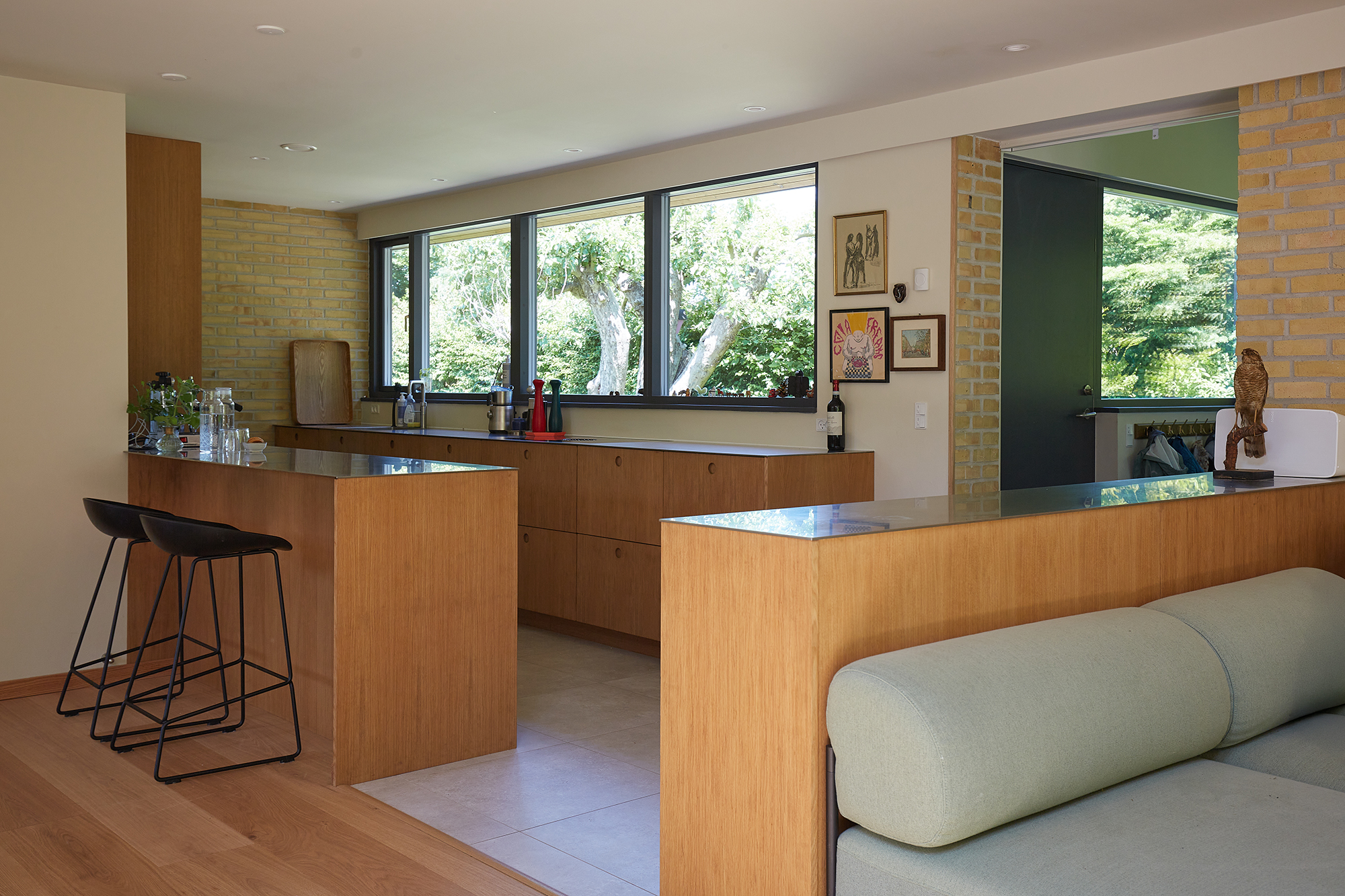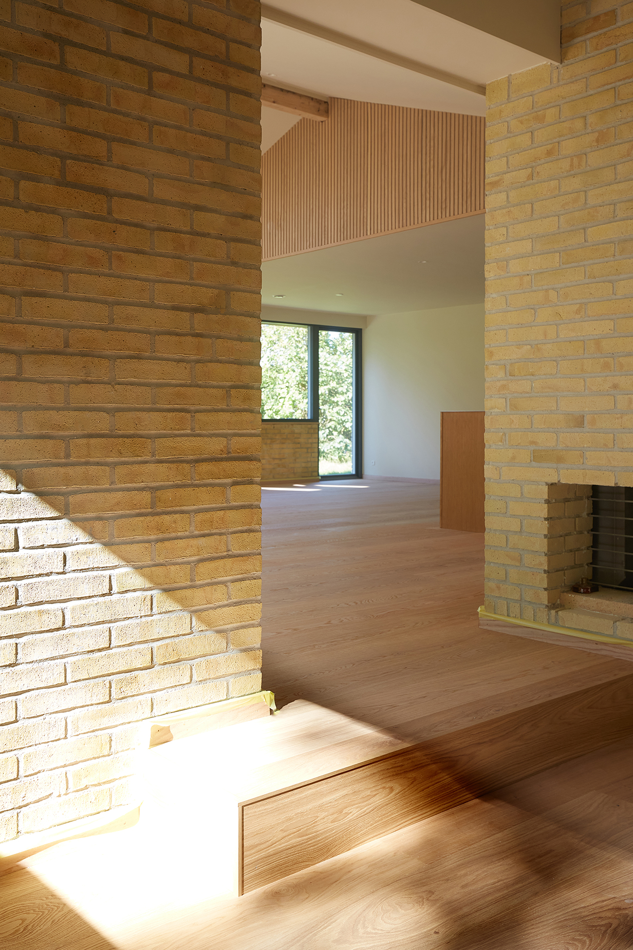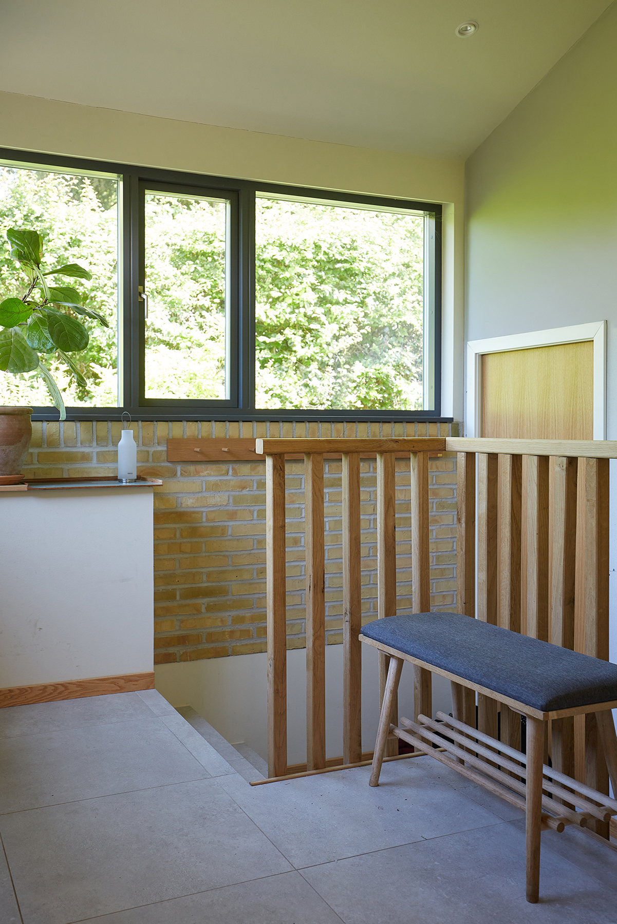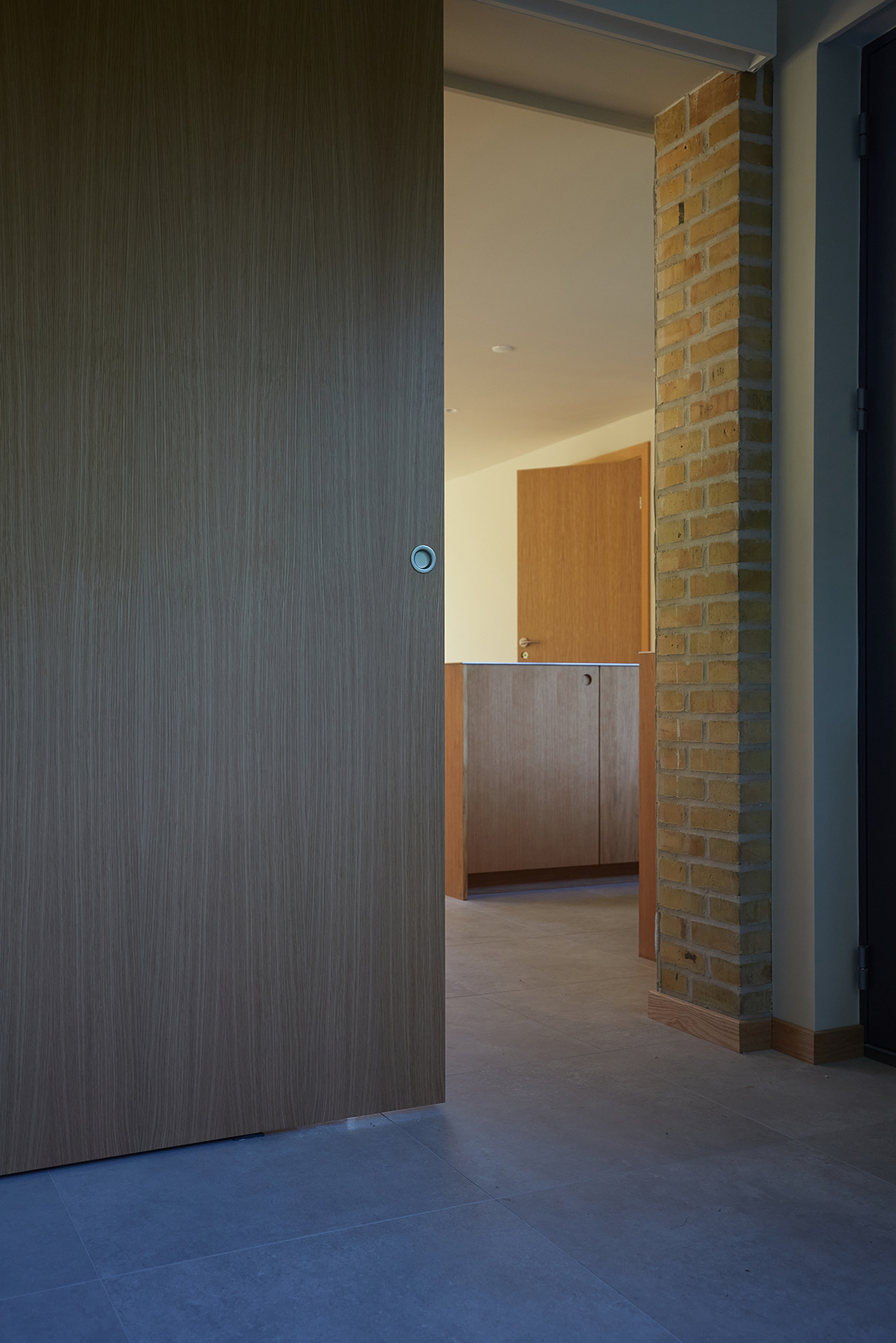 Det tidligere lave tag i den ene side af boligen er blevet forøget i højden med ny tagkonstuktion, og udgør idag en lys og luftig entre med direkte adgang til kælderetagen. Den originale indgang beliggende kun få meter fra bryggersindgangen, blev nedlagt til fordel for et mere rummeligt køkken. Planløsningen er gentænkt med henblik på bedre udnyttelse af alle kvadratmeter. Udvalgte indervægge er fjernet, hvilket har skabt større, mere fleksible og åbne rumforløb, som understøtter et nutidigt familieliv.