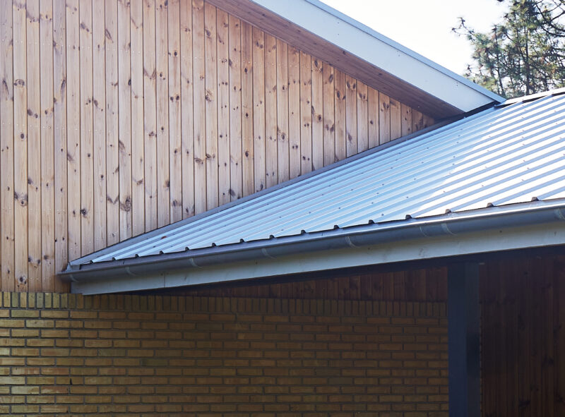 Det oprindelige bølgeeternittag, som indeholdt asbest, er blevet udskiftet med et pandepladetag i sølvgrå metal med lodrette spor, der refererer til det tidligere tagmateriale. Taget er udført med nye taghætter /ventilation og tagrender og -nedløbsrør i zink. Ligeledes er alle vinduer og døre er udskiftet med nye alu/træ rammer i antracitgrå farve for at bevare det mørke udtryk af horisontale vinduesbånd mellem murene og de svævende tagflader.