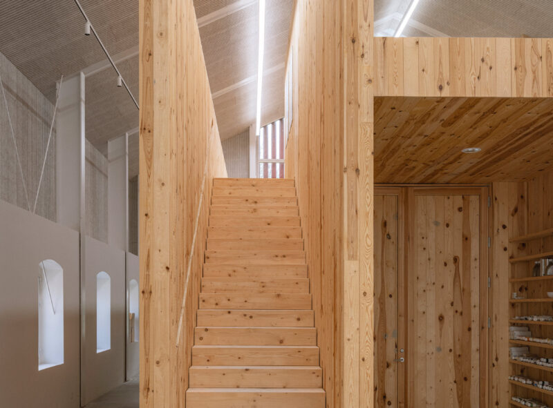 Vi har taget er egnsmæssigt afsæt for alle materialer, der primært er udført i træ. På denne måde er akustiklofter udført i træbeton og derudover er hele interiøret primært konstrueret i og beklædt med træ i interiøret. Det samme gælder for størstedelen af facaden.