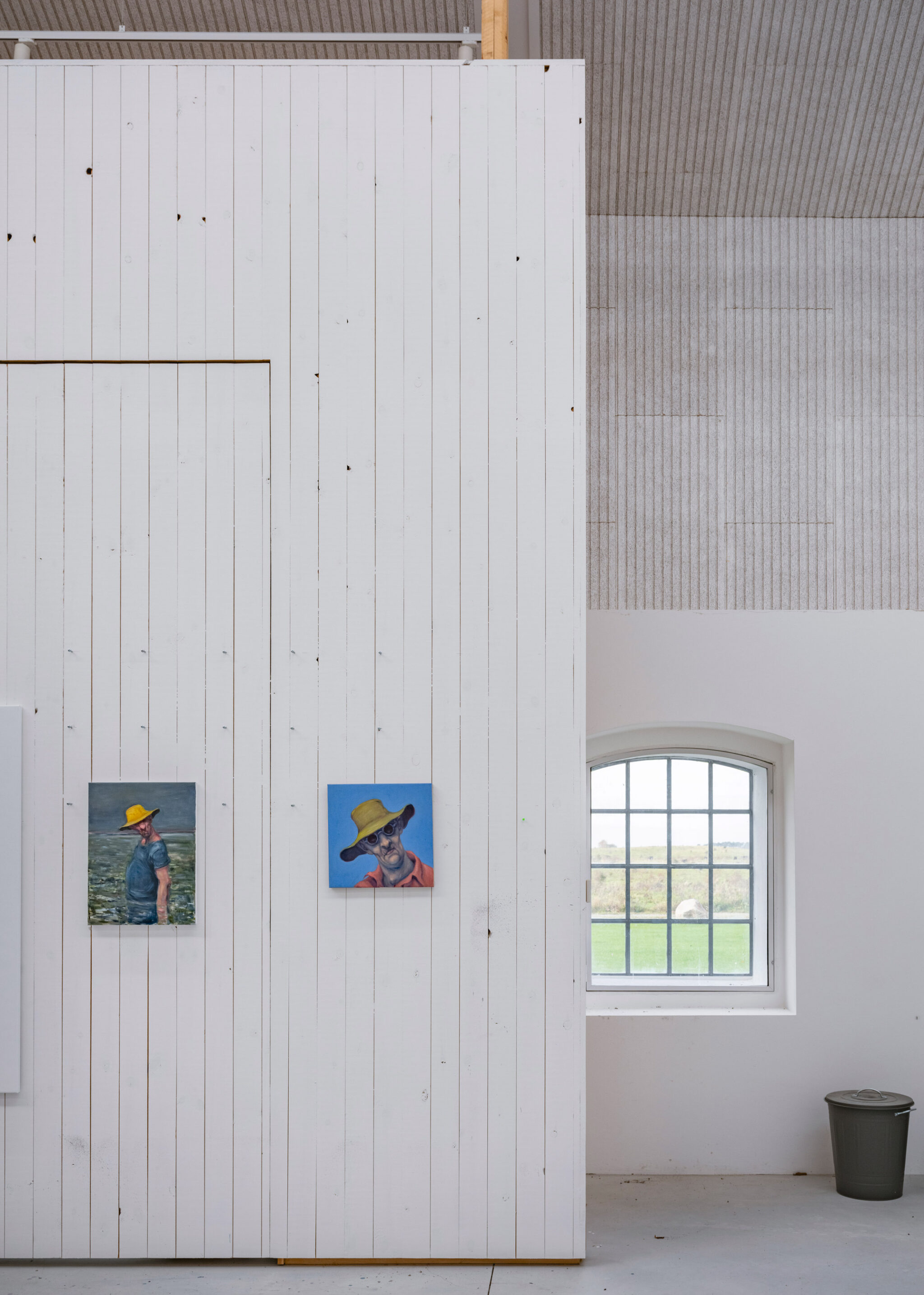 I atelierets hovedrum er to funktionelle malervægge, der delvist kan skydes til side. Den største væg måler 22 x 5,5 meter. Som to hvide skiver kører de på et skinnesystem og giver kunstneren optimale flader til hans ofte gigantiske lærreder. Når begge malervæggen køres til side, er der kig på tværs af rummet til engen udenfor.