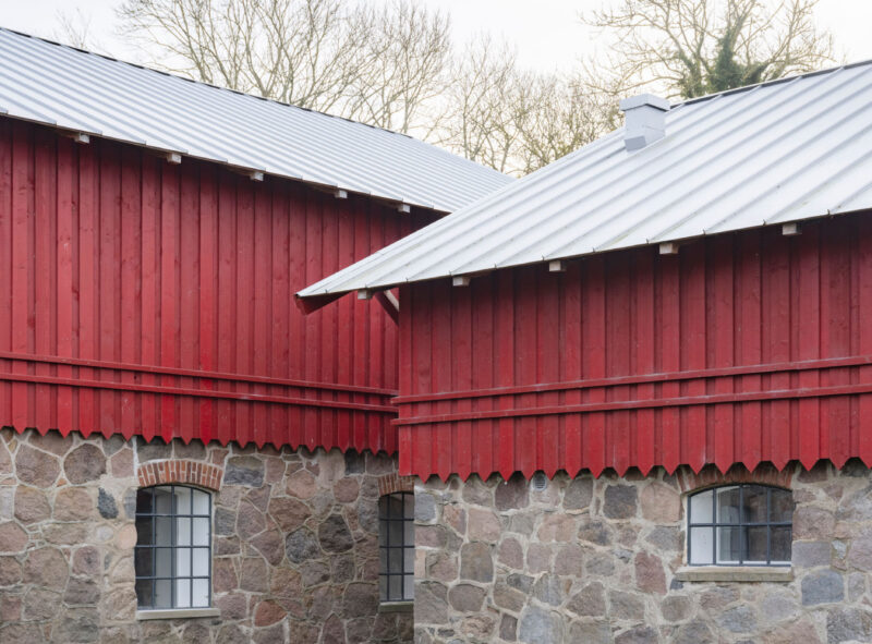 Bygningens ydre trækker smukke tråde tilbage i tiden. De historiske kampestensmure er nænsomt renoveret, og placeringen af staldvinduerne er bevaret. Der er indsat nye vinduer i historisk stil. Træbeklædningen er en kopi af den oprindelige en-på-to-bræddebeklædning, rødmalet i den originale farve fundet på stedet. Også spærene er profileret tro mod den oprindelige form, imens det store saddeltag mimer det oprindelige bliktag.