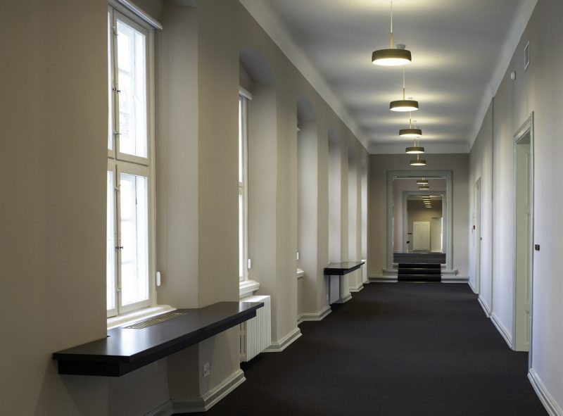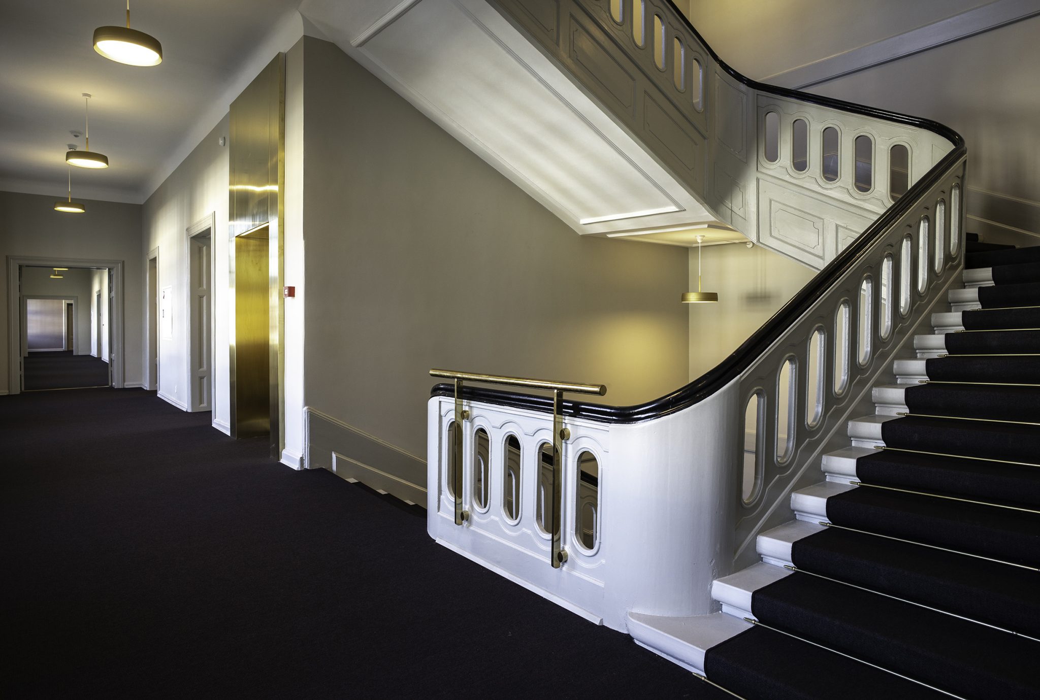 Udgangspunktet har været, at de eksisterende fysiske rammer i størst muligt omfang skulle forblive intakte, og samtidig klargøres til den nye funktion som kontorarbejdsplads ved tilføjelse få nye elementer. De to hovedtrapper er restaureret, der er opsat ny belysning og lagt nye, slidstærke gulvtæpper. Der er etableret tekøkkener, fælles opholds- og møderum, nye toiletter, samt i alt 27 åbne, flerbruger kontorrum.