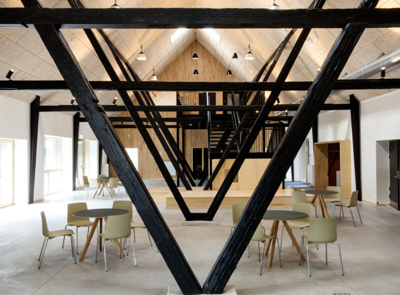 En af de rigtig stærke elementer i projektet er den bevarende tilgang, hvor den originale spærkonstruktion er blevet bevaret og fremhævet. Det er en god måde at integrere bygningens historie i det nye design på, samtidig med at man sikrer et moderne og funktionelt rum. Man ser tydeligt, hvordan de oprindelige elementer som brugsspor på facaden og den gamle pigstensbelægning er blevet indarbejdet i det nye design, hvilket giver en autentisk og historisk forankret oplevelse.