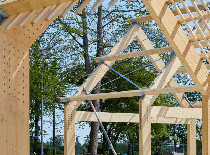 Naturlige materialer benyttes som beklædninger inde og ude, og detaljer eksponeres. Spærkonstruktionen i nybygningen udføres i limtræ med synlige detaljer og fremstår således som en moderne fortolkning af den oprindelige spærkonstruktion.