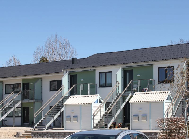 Klimaskærm i form af det monterede facadepudssystem inkl. isolering fra sokkel til tagkonstruktion optimerer bygningernes evne til at bevare det optagede varmebidrag.