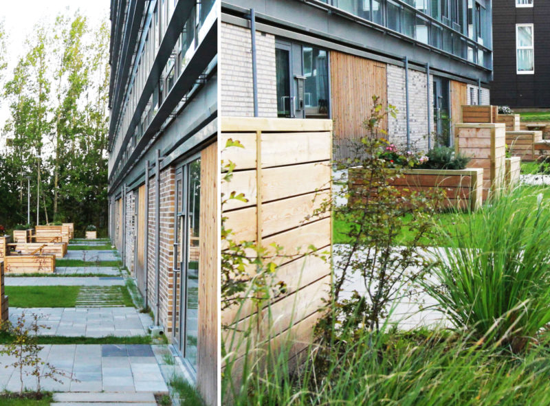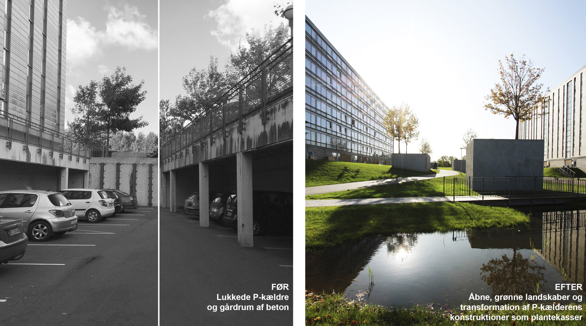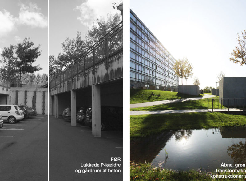 De eksisterende hævede parkeringsdæk er revet ned, og boligblokkenes tidligere lukkede kældre indgår i en samlet facaderenoverings-strategi, der er med til at nedbryde gårdrummenes store skala. Gårdrummene er åbnet op og skaber varierende og indbydende grønne haver.