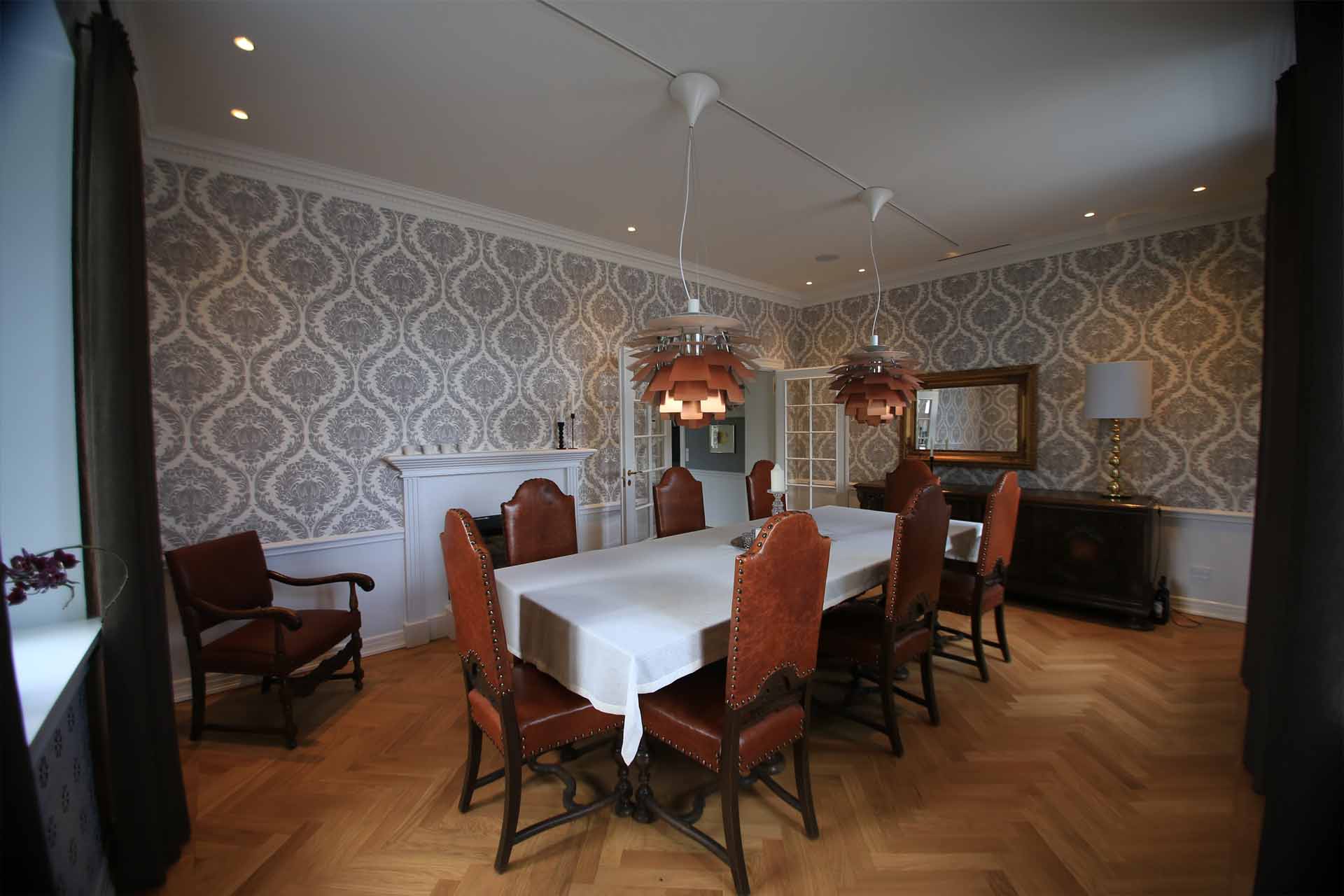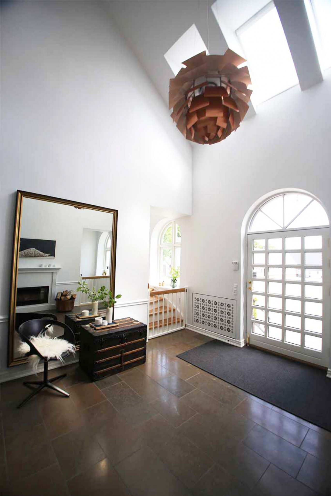 Førstesalen er indrettet med familiens private værelser i den ene fløj og med kontor og mødelokaler i den anden fløj. Her er konstruktionsbjælkerne blevet frilagt og forbinder fløjene og skaber en unik oplevelse. Den højtliggende kælder er blevet udnyttet og indrettet til ekstra sociale samlingsrum for familien, her i blandt biograf og fitnessrum.