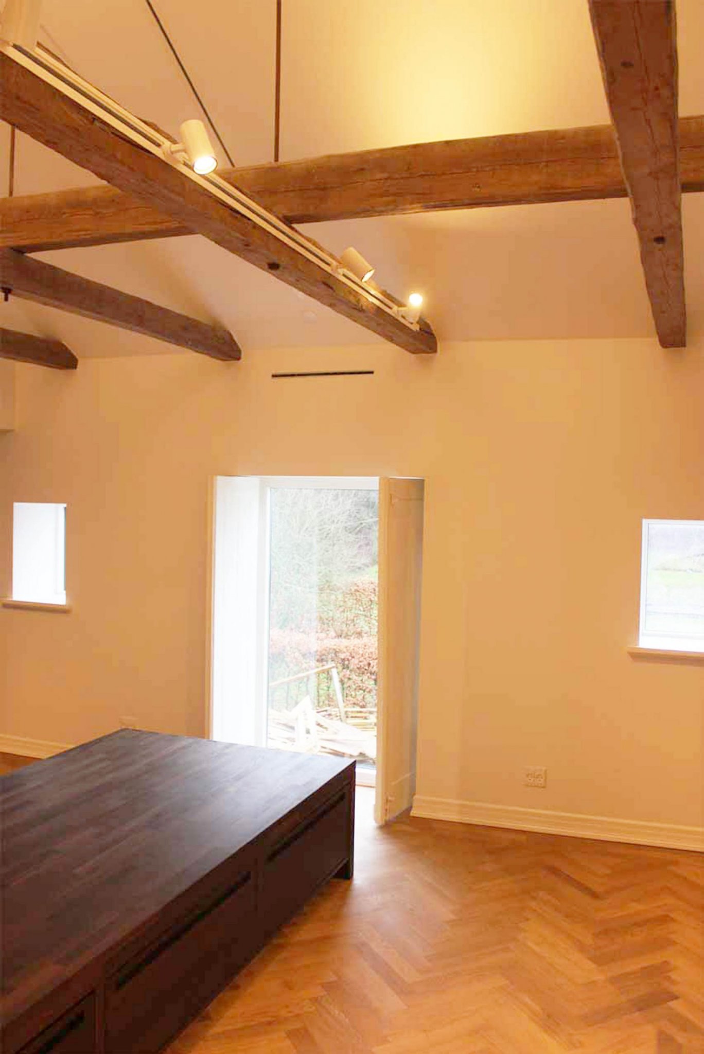 I det nuværende omklædningsrum på førstesalen var der før renoveringen et opbevaringsloft til korn og hø, med en centralt beliggende dobbeltdøret lem i facaden orienteret mod markerne. Under renoveringen blev denne lem flyttet ind på indvendige side af et stort isat vindue. Dermed kan lemmen både stå åben og give en fantastisk udsigt over markere, men kan også blive lukket og give fuldstændig privathed. Dette element er blot et eksempel på en nyfortolket detalje. Bjellerup Ladegårds klassiske stil forenes med moderne løsninger og alle de funktioner, der skal til, for at leve op til den moderne families hverdag.