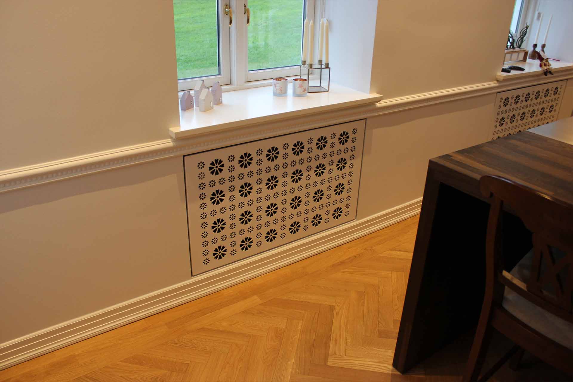 Det eksisterende stuehus var fuld af detaljer, som er blev genskabt eller nyfortolket og etableret som faste elementer i den færdigrenoverede herregård. Eksempelvis er mønsteret fra vinduerne genbrugt på radiatorskjuler og plader som er blevet specialdesignet og stanset ud i metal.