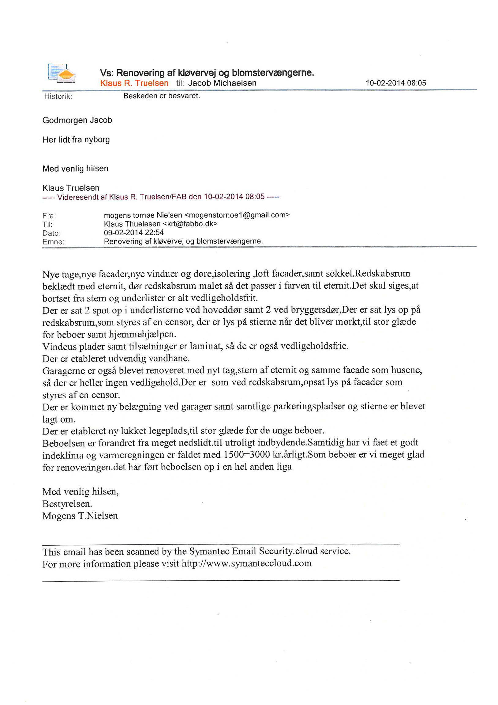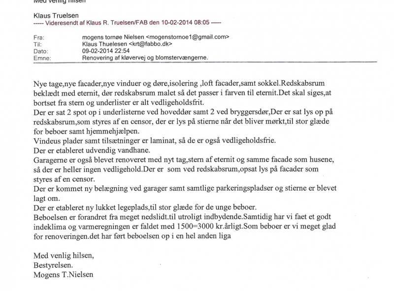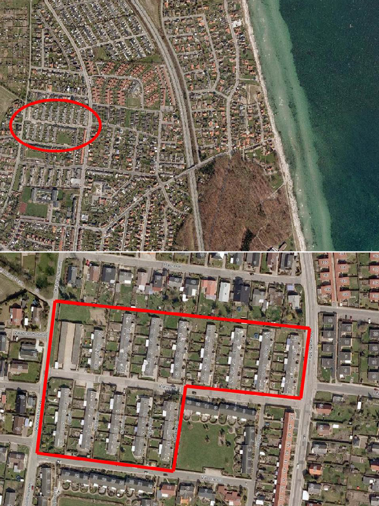 De 76 almene rækkehuse i Blomsterkvarteret i Nyborg er ca. 82 m2 og har alle en lille have. Rækkehusene, som er opført i slutningen af 50´erne, har i de senere år gennemgået en gennemgribende renovering, som har løftet området både fysisk og socialt, og som samtidig har medført lavere forbrugsregninger og senere huslejenedsættelser pga. mindre vedligehold for beboerne. Renoveringen har taget udgangspunkt i et fælles ønske om at vælge de rigtige materialer, fokusere på et lavere energiforbrug, sikre minimal vedligeholdelse og skabe et bedre image for området. Konkret er der foretaget en isolering af eksist. facader. Der er sat skærmtegl op i en gullig farve for at bevare den oprindelige arkitektur og for at lyse området op. Skærmteglene er vedligeholdelsesfrie og begrænser udgifterne til løbende vedligehold. Herudover er de nedslidte tagflader skiftet, og der er kommet ny tagflade udført i bølgeplader i farven antracit samt nye metaltagrender. Der er også sat nye vedligeholdelsesfrie træ/alu døre og vinduer op, og i forbindelse med renoveringen, er der lavet en ny sokkel, således at alle kuldebroer er elimineret. Udhænget er malet hvidt, og der er indbygget spots, som lyser indgangspartierne op. Garageanlægget er renoveret i samme arkitektur som boligerne i den udvendige klimaskærm, og der er nye flisebelægninger på p-pladser. Herudover er der foretaget en gennemgribende renovering af legepladsen, hvor man, efter beboernes ønske, har genskabt legepladsen i en form, hvor familierne sidder i midten af legepladsen frem for omkring legepladsen. Der var regnet med en månedlig besparelse på ca. 500 kr. pr. mdr. på forbruget, som har vist sig at holde stik. Anvendelsen af vedligeholdelsesfrie produkter har medført, at driftsudgifterne er betydeligt reduceret. Selve løftet af området har også medført, at der nu en udtalt stolthed fra beboerne om at vise deres boligområde frem, og er nu meget engageret i at få den indv. del med bl.a. udskiftning af alle indv. døre.