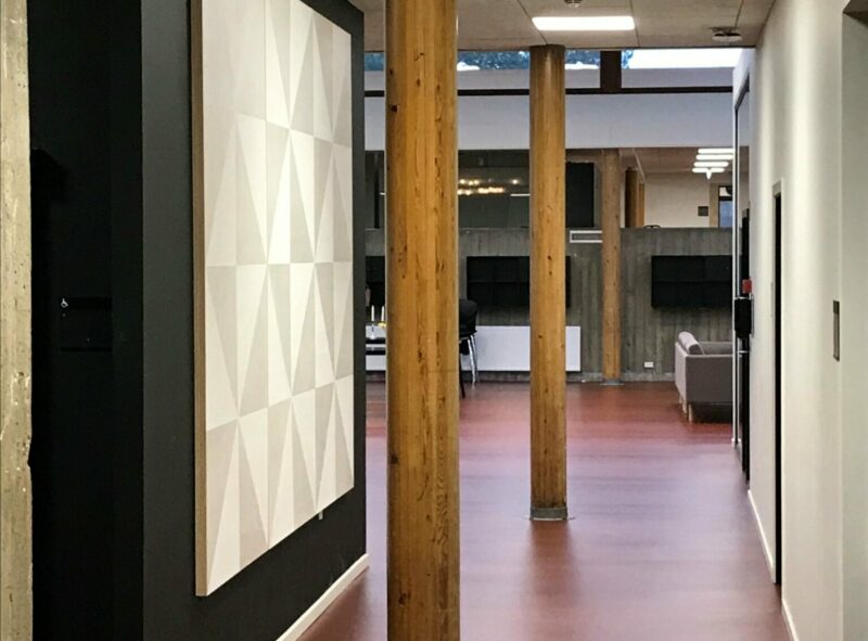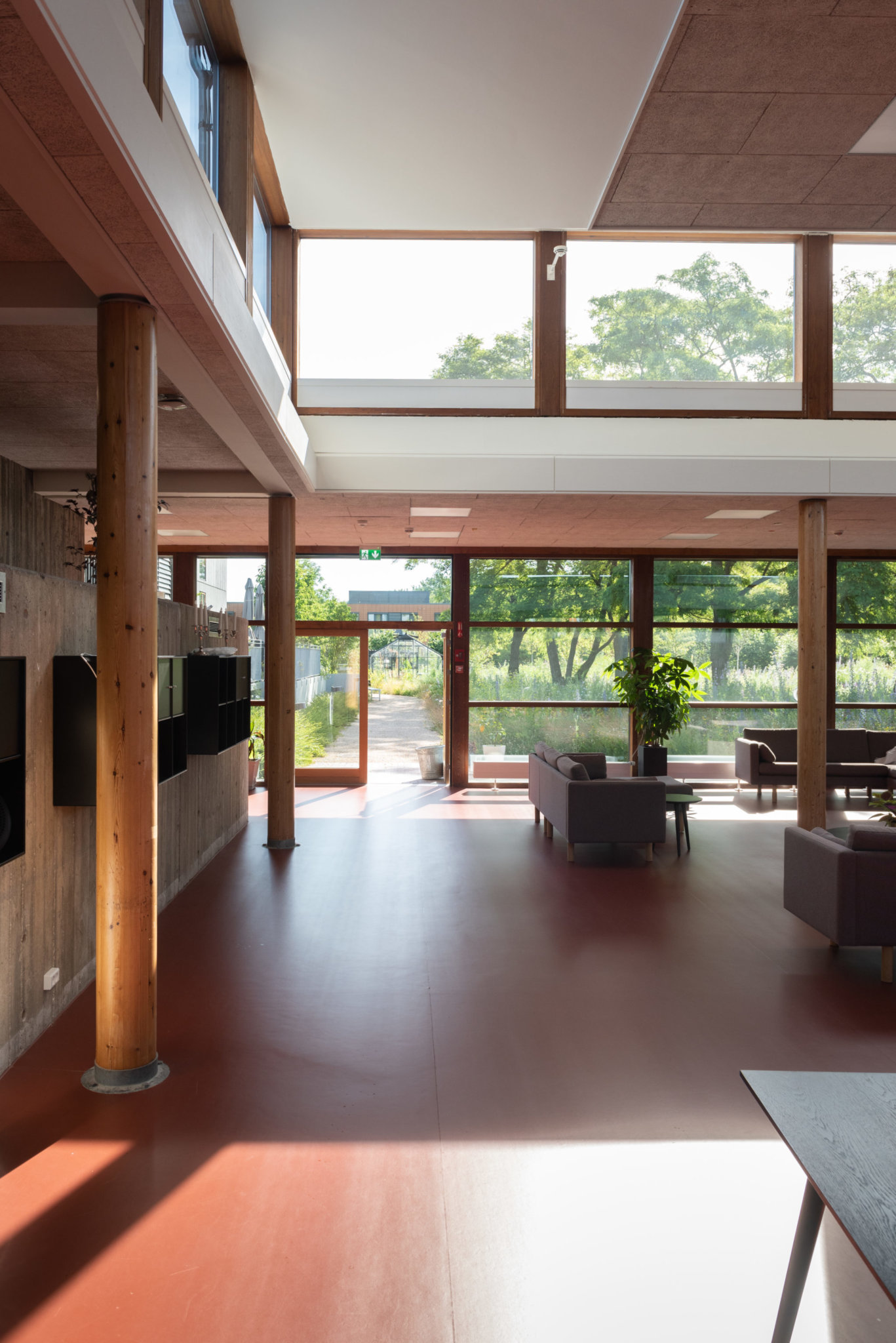 Arkitekturens brutalistiske stiltræk er modereret til fordel for tidens egne stiltræk. Orange døre er udgået. Der er kommet glasvægge. Søjler af limtræ er bibeholdt. Byggeteknikken, der bød på så mange overraskelser, viste sig at gå i spænd med intentionerne. Pcb’en er blevet bortsaneret og med den forsvandt mange originale bygningsdele. Døre og vinduer fx. De skulle udskiftes alligevel, så en del overvejelser om bevaring eller ej har givet sig selv.