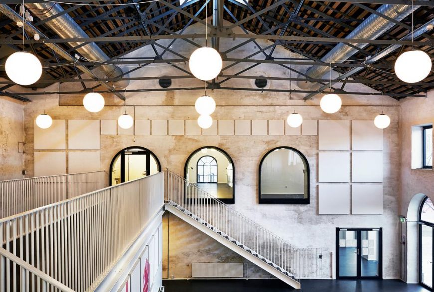 De akustiske udfordringer er løst meget innovativt, så alle rum overholder gældende krav til efterklangstid i børneinstitutioner. Der er opsat akustik paneler med motiver, der fortolker de oprindelige fabriksfunktioner: Værksted, kedelrum, skorsten osv.