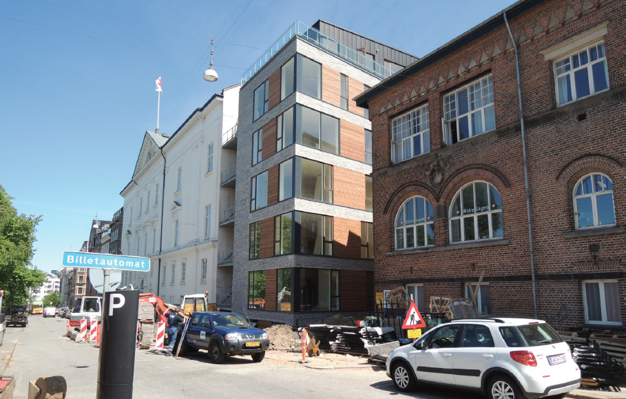 Den svære øvelse at tilføje nyt til eksisterende er løst ved at sammenkoble byggeriet til nabobebyggelsen, Frimurerlogen, med et altanelement, som herved markerer tydeligt, at der er tale om to selvstændige bygninger. Bygningen er opført i lys grå tegl med vinduespartier i træ/aluminium og forskudte trælamel-elementer, som giver bygningen en variation og lethed i sit udtryk.