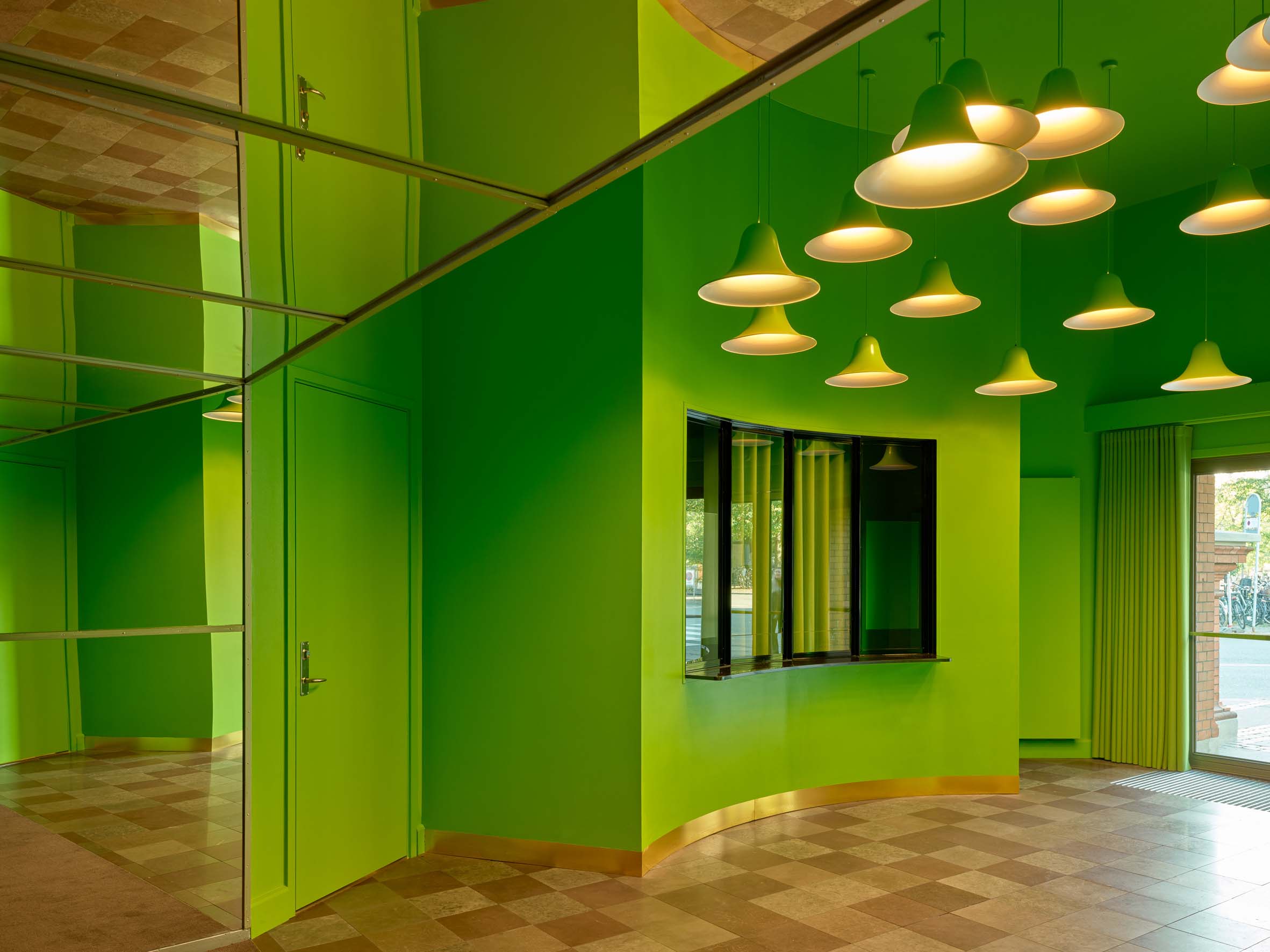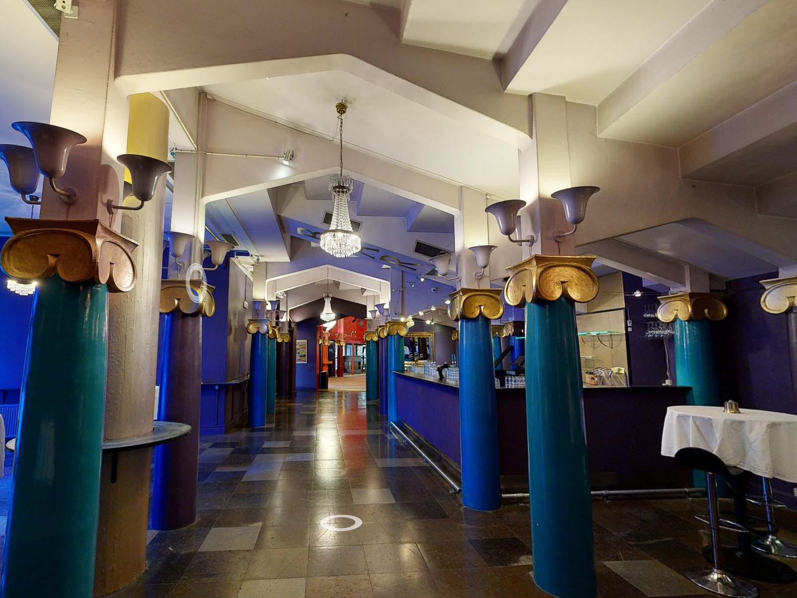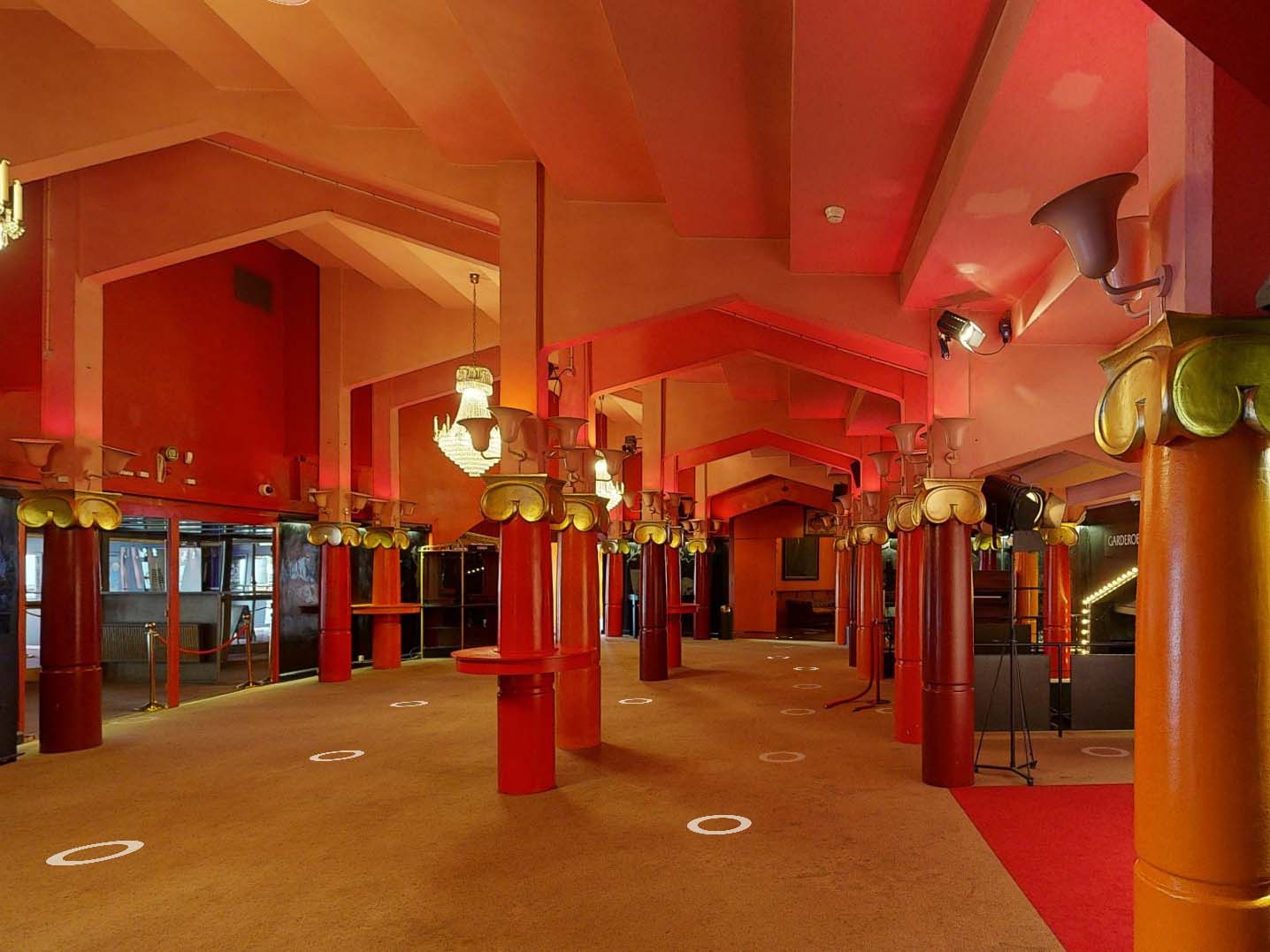 Indenfor er den nye disponering af ankomstarealer, barer, garderobe og vejen mod toiletterne tilrettelagt med størst mulig imødekommenhed og ud fra bygningens givne symmetri. Ved nedgang til garderoben møder gæsterne ikke længere en mørk væg, men et smilende ansigt, som modtager overtøjet og er med til at byde indenfor til en aften fyldt med oplevelser.