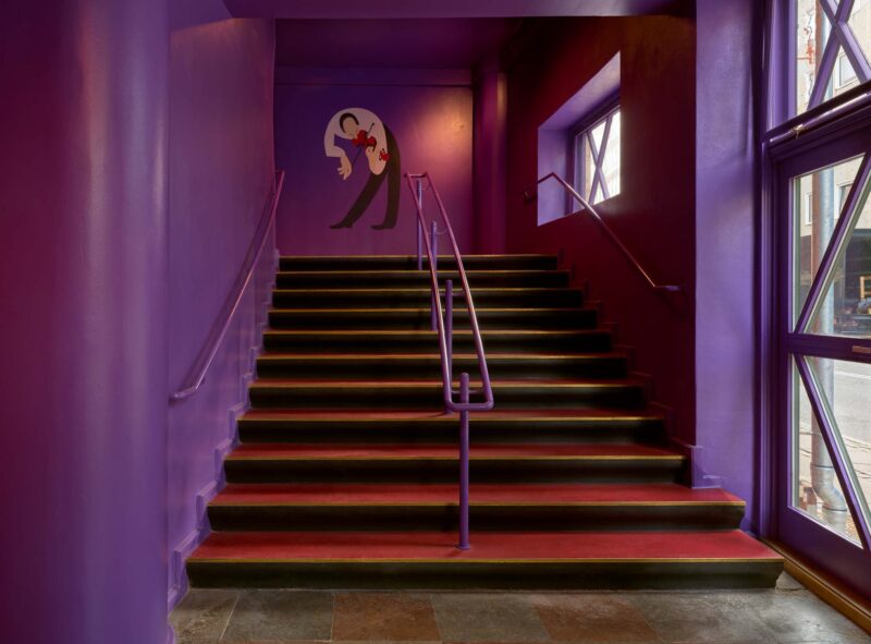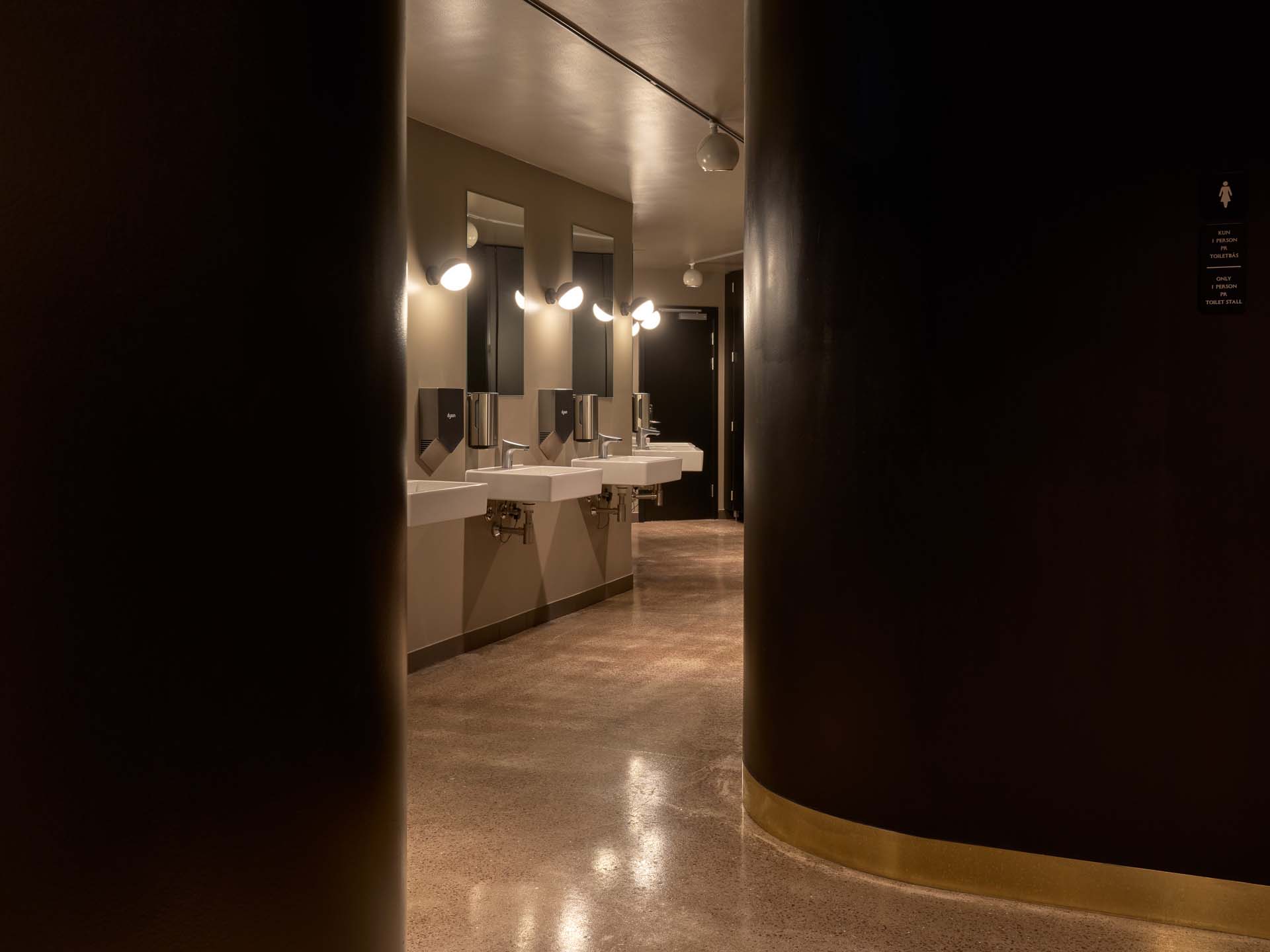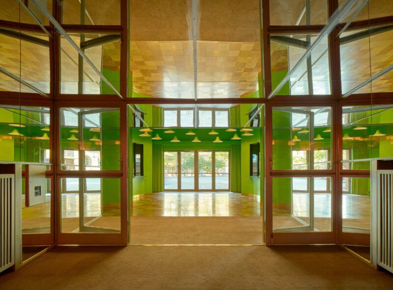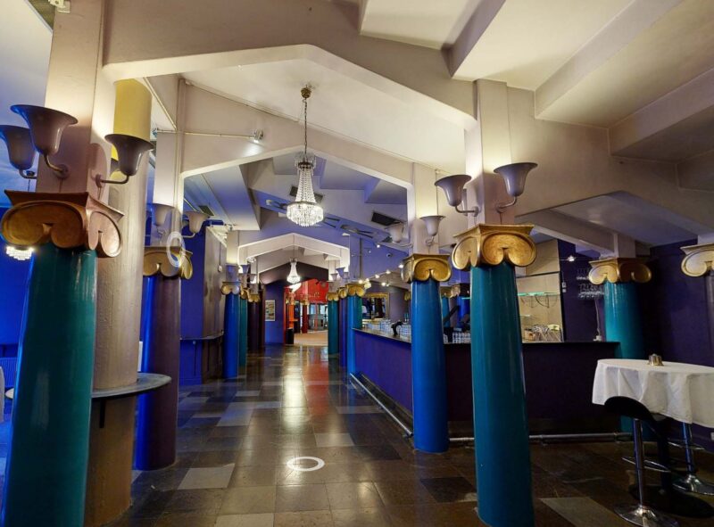 Indenfor er den nye disponering af ankomstarealer, barer, garderobe og vejen mod toiletterne tilrettelagt med størst mulig imødekommenhed og ud fra bygningens givne symmetri. Ved nedgang til garderoben møder gæsterne ikke længere en mørk væg, men et smilende ansigt, som modtager overtøjet og er med til at byde indenfor til en aften fyldt med oplevelser.