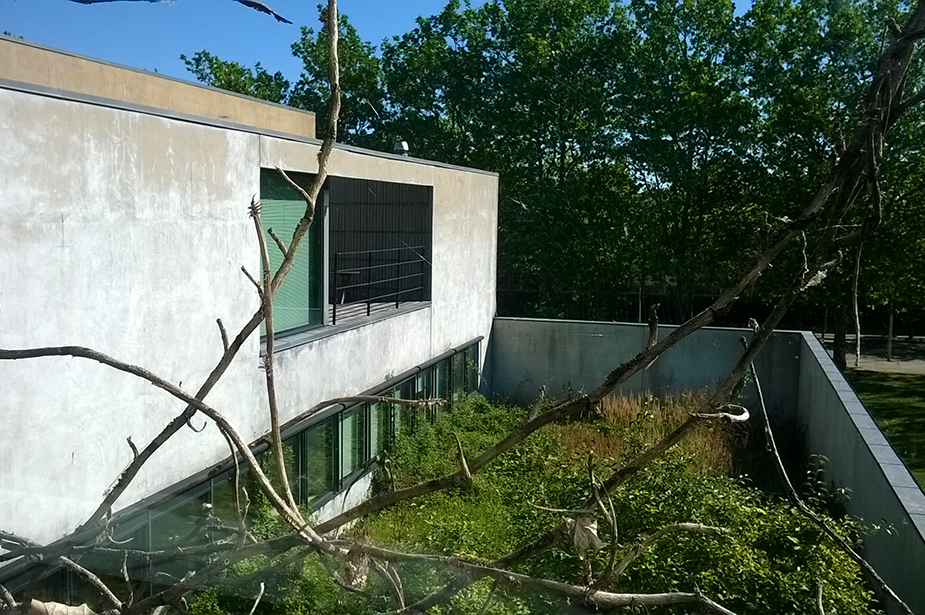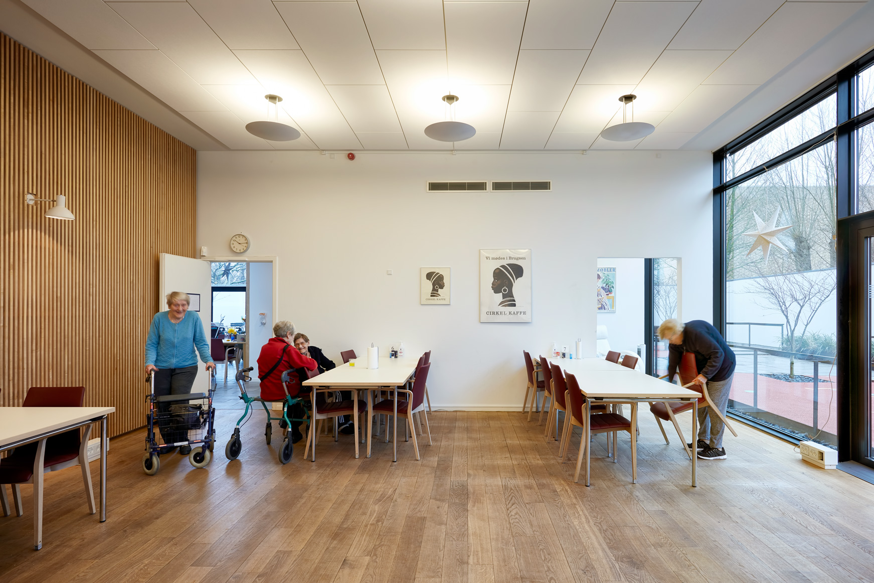 Arkitekturen i huset er markant og byder på mange kontraster og sanseoplevelser i rum og materialer, som fint understøtter stimulering af de ældres sanser. Der er store, høje, lyse rum til fællesaktiviteter, spisning og fordeling. Der er mindre, lukkede rum til stille funktioner. De tidligere retssale er indrettet til spiserum og træningsrum, en del af de tidligere kontorer er indrettet til opdelte aktiviteter, anretter-køkken, hvilerum, toiletter mm. Alle borgerrettede funktioner er placeret i stueetagen hvor der er fuld tilgængelighed for kørestols- og rollatorbrugere. Supplerende borgerfunktioner er placeret på 1. sal, hvor der er adgang via elevator og trapper. Tre ud af fire udvendige gårdrum var tidligere lukkede og kun til at kigge ud på. De er nu tilgængelige og en del af daghjemmets opholds- og bevægelsestilbud. Gårdrummene er indrettet med belagte permeable flader, der fungerer som ”øer” midt i det grønne. Der er valgt en beplantning af høje græsser i højbede af jern. Det mindste og nordvendte gårdrum er fastholdt som et utilgængeligt grønt udsigtsrum.