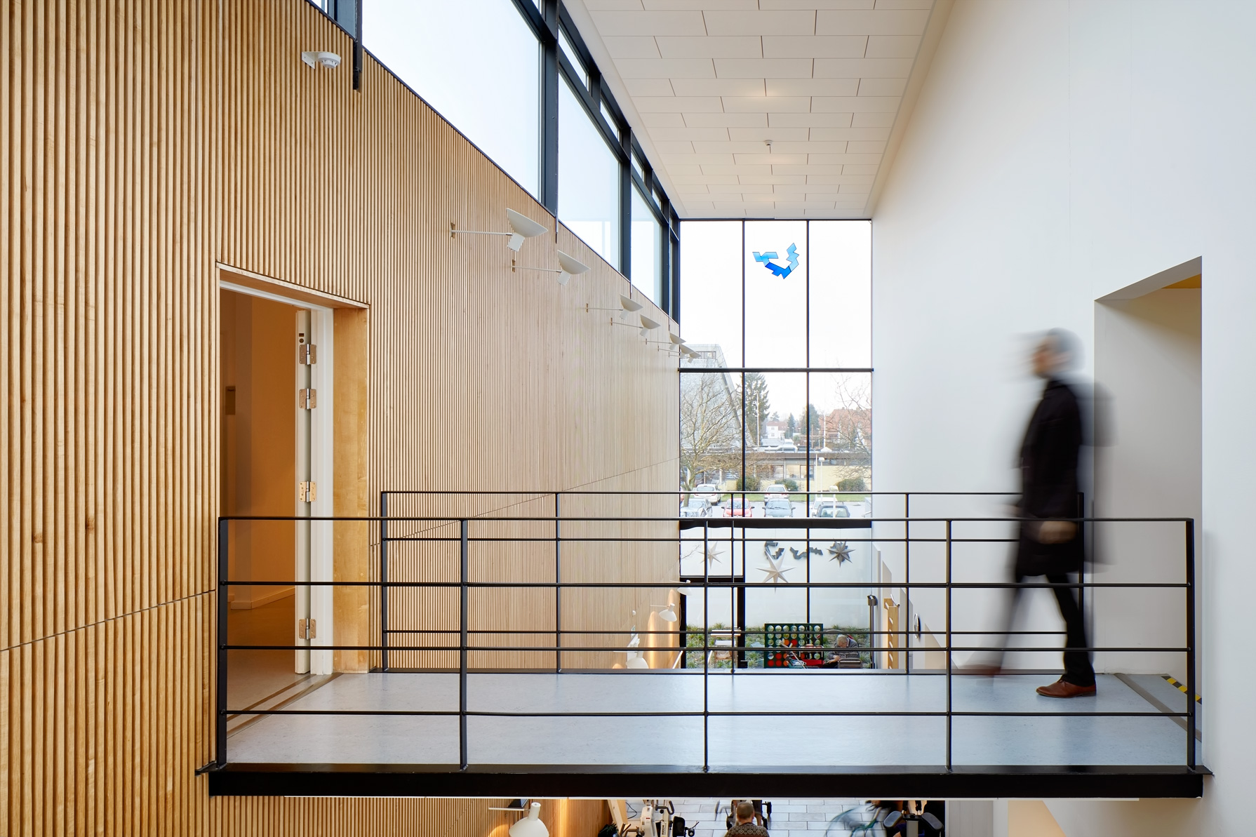 Bygningen fungerer fint med brugbare og fleksible rum, selvom kompromiser blev indgået. Træning foregår også ved ture på trapper og gangbroer rundt i huset. Garderobe og rollatoropbevaring direkte i den åbne foyer blev også tidsbesparende for personalet.