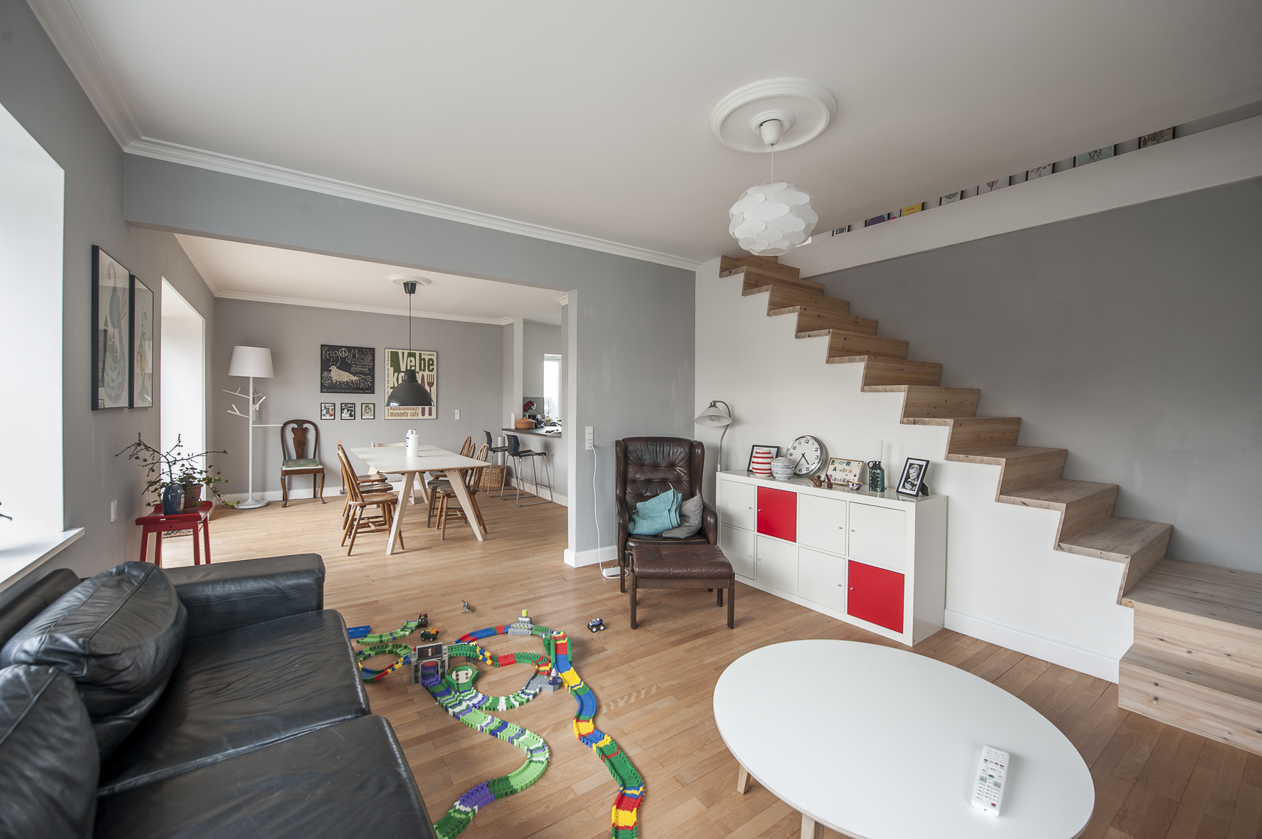 1. april 2013 flyttede familien ind, huset var nu opdelt i to, en stueetage på 120 m2 og en bolig på 208 m2 fordelt på 1.sal og en tagetage med skråvægge. Begge boliger har mange fine detaljer, godt lysindfald, køkkenerne er åbnet op mod stuen, og der er en åben trappe fra første sal til en tagetage med isoleringen placeret ovenover de flot eksponerede spær. De gamle gulve er bevaret og fremstår rustikt, ligesom stuk, paneler og oprindelige døre er renoveret så husets stil hænger sammen. Trætrappen til 2. sal er slebet ned og fremstår i fint samspil med terrazzotrappen til de nederste etager. Haven er ”ryddet for skov” og reetableret med højbede og nye frugttræer, og der er etableret træterrasse i stueetagen og altan på første sal.