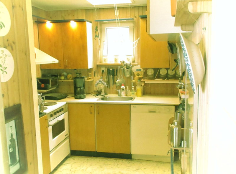 Køkken: Åbnet op fra stuen. Alle rustikbrædder pudset og genanvendt. Som rem til køkkenåbningen er anvendt drivtømmer fundet langs vandet. Væggen bestod af 1/4 sten. Skåret hul med en stor vinkelsliber. Eksisterende ovenlys erstattet med et nyt, som er tilpasset de eksisterende forhold (spær afstand). Ovenlysset er mekanisk.