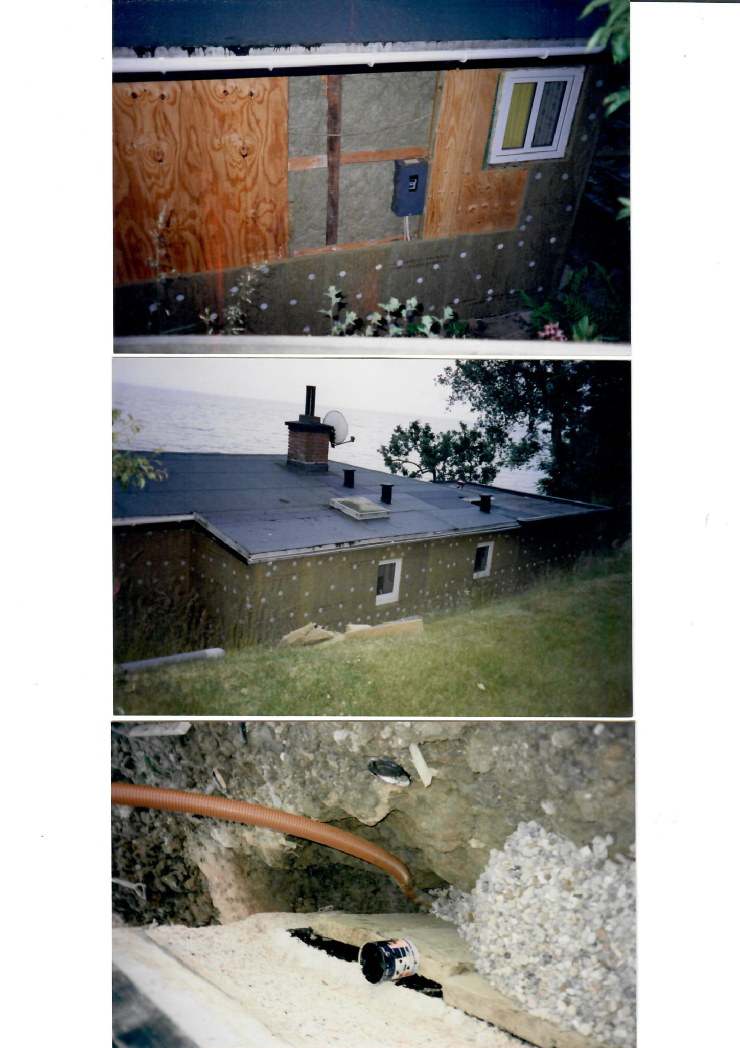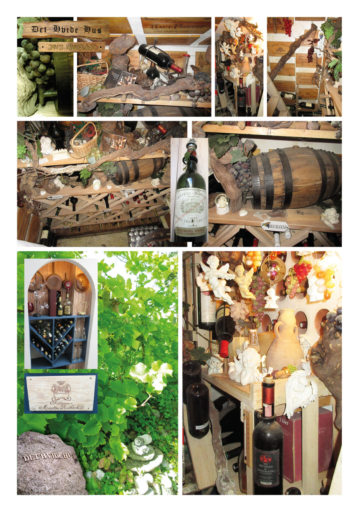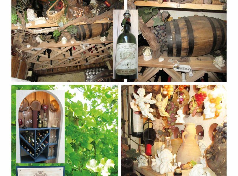 Der blev gravet 25m3 af skrænten. Støbt op under husfundamentet, som blev asfalteret, påsat drænbatts, lagt et omfangsdræn, over dette drængrus. Derefter hugget gennem betongulvet ned til køkkenkælderen. Fjernede alle mursten i kælderen, som blev lagt ind i skrænten som dræn. Skræntjorden blev lagt tilbage og der blev plantet en vinrække. Kælderen blev indrettet som vinkælder (se billede). Der er ført udluftning fra kælderen til det fri. Hylderne er genbrug fra skillevæggen mellem de tidligere stuer. Der er muret drænrør ind i vægge, til opbevaring af vin. Siderne på de gamle vinkasser er lakkeret og opsat på væggene og loftet. Kælderen er den perfekte vinkælder, takket været omfangsdrænnet, som tager overflade vandet fra kælderen. Der er ingen sollys. Jeg har haft en termohydrograf kørende den viste: Nederste hylde 10grader og en fugtighed på 90%. Øverste hylde 17grader og en fugtighed på 70%. Fugtigheden og temperaturene er konstante året rundt. Jeg har ligeledes placeret en fryser i kælderen, som medfører mindre strømforbrug. Når man går op fra kælderen, kan man se vinrækken igennem køkkenvinduet.
