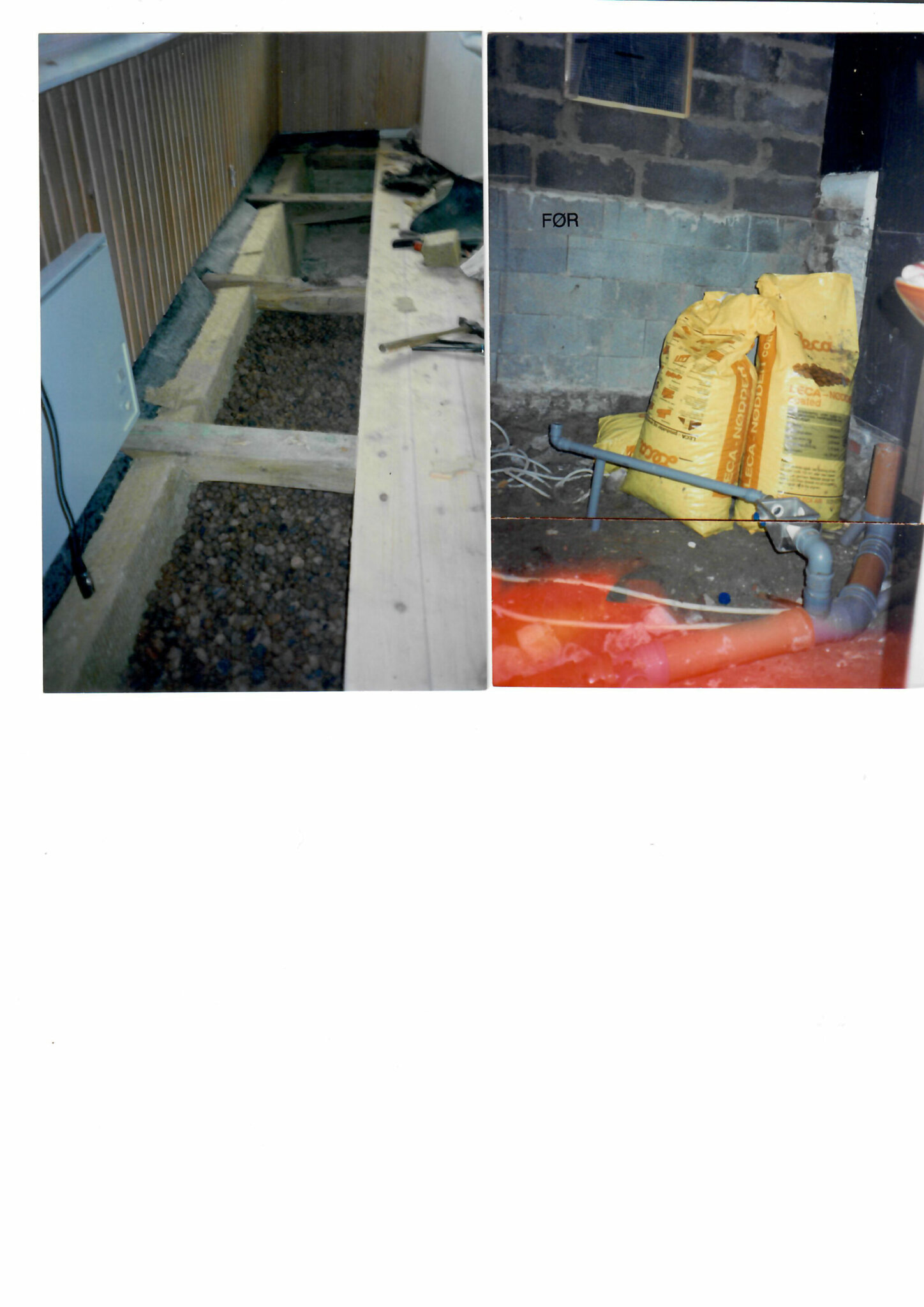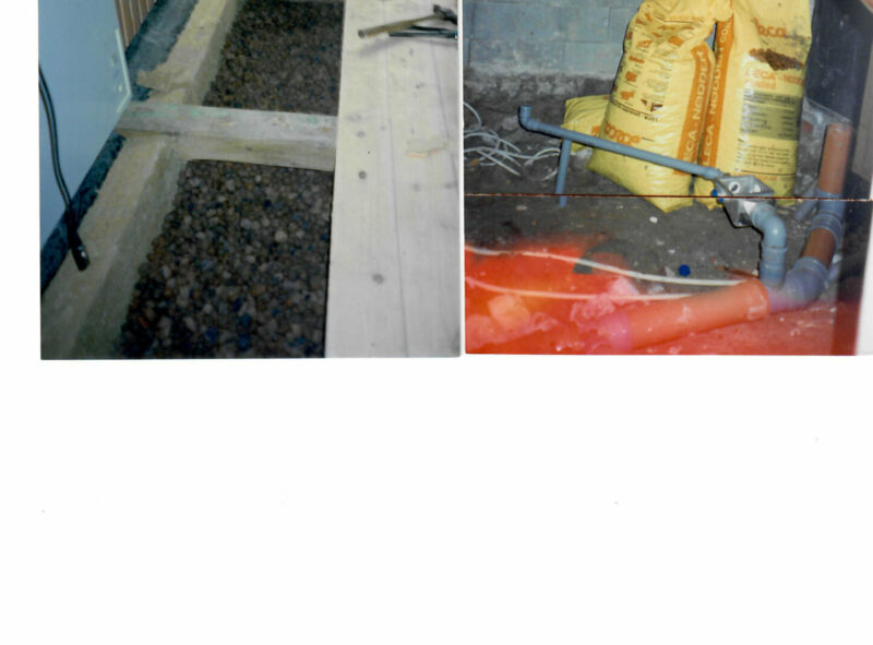 Stuegulv taget op, (muret søjler på jord, strøer, fyrretræs gulv). Der er lagt 170mm lecca, dampstandsende lag plastik og derefter 100mm mineraluld (se billede). Fundamentet repareret indefra og udefra. Ventilationskanaler til gulvet afblændet. Fyrretræsgulvet genbrugt, da træet er meget bedre end det man kan købe i dag. Gulvet pudset og lakkeret.