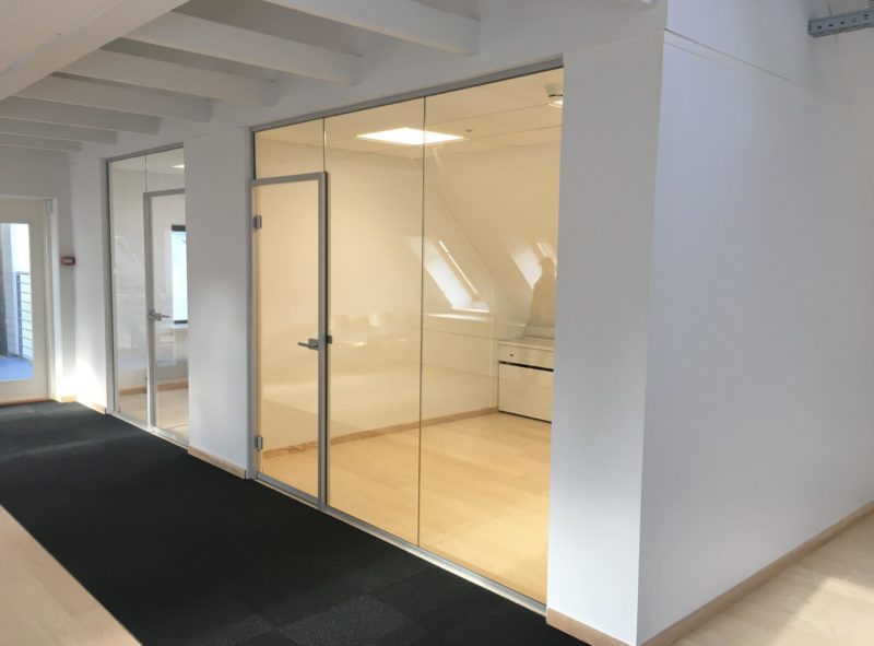 Derudover er der en yderligere gevinst, idet gips- og glasskillevæggene umiddelbart kan genbruges andre steder i kontoret og mellem etagerne. Løsningen er designet for cirkularitet.