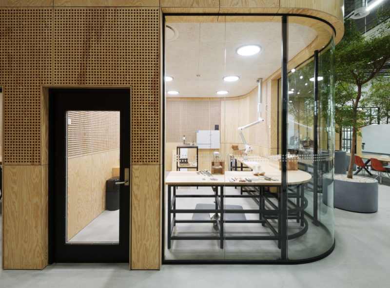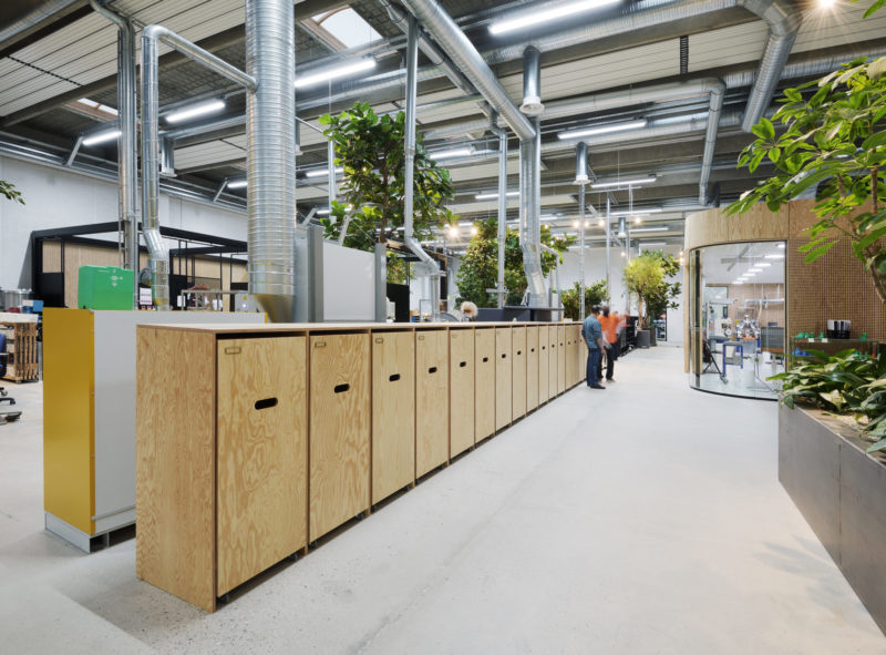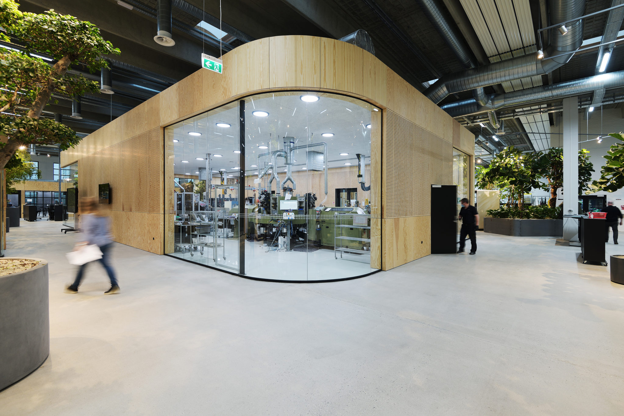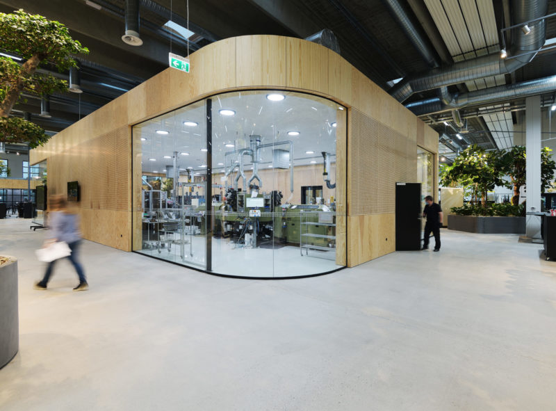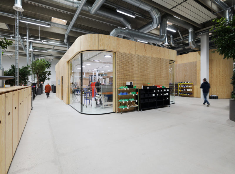 De nye, rumdannende elementer er alle beklædt med træ i form af krydsfinérsplader. Udover at fremhæve de nye tiltag via kontrasten til det i øvrigt ”rå” og industrielle rum og skabe en mere varm og intim atmosfære, er træ også en bæredygtig løsning, bl.a. i kraft af sin genanvendelighed.
