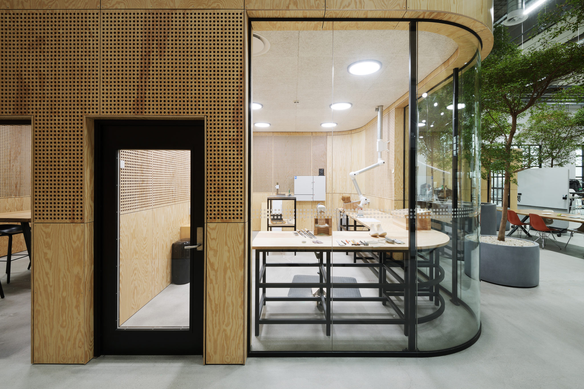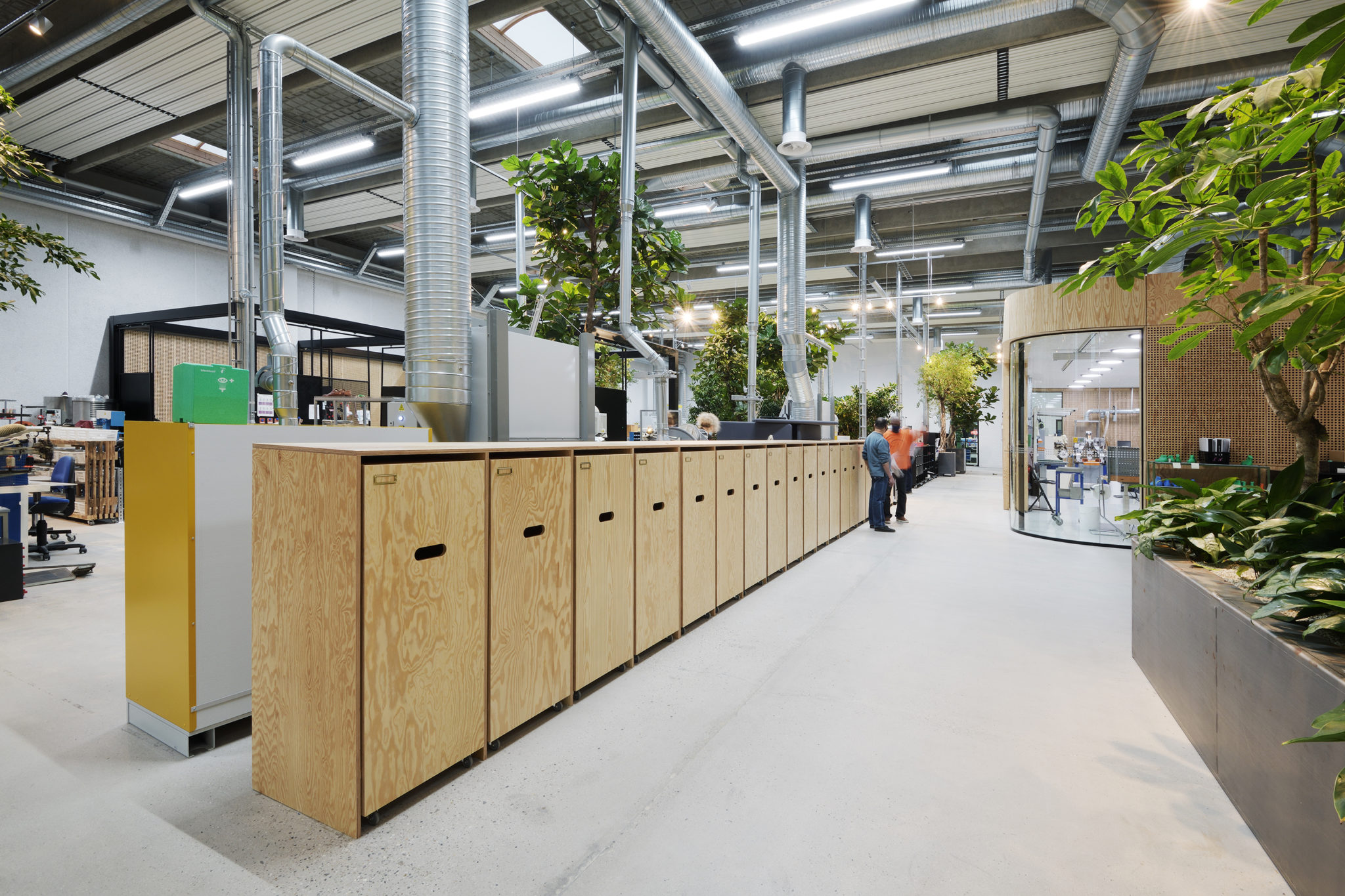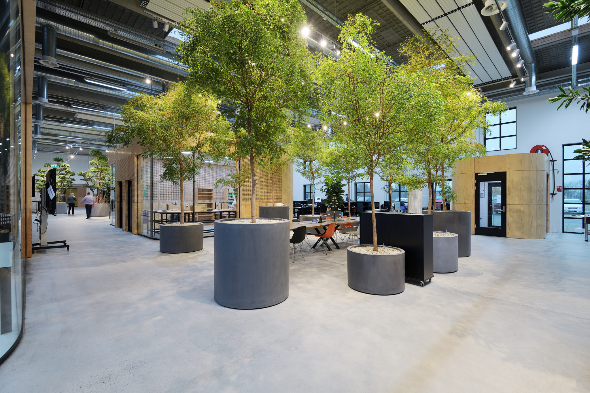 De nye, rumdannende elementer er alle beklædt med træ i form af krydsfinérsplader. Udover at fremhæve de nye tiltag via kontrasten til det i øvrigt ”rå” og industrielle rum og skabe en mere varm og intim atmosfære, er træ også en bæredygtig løsning, bl.a. i kraft af sin genanvendelighed.
