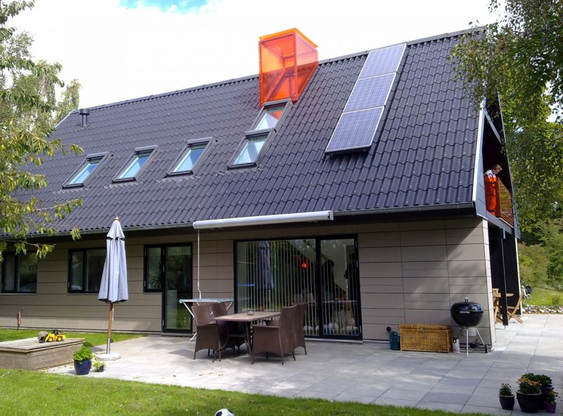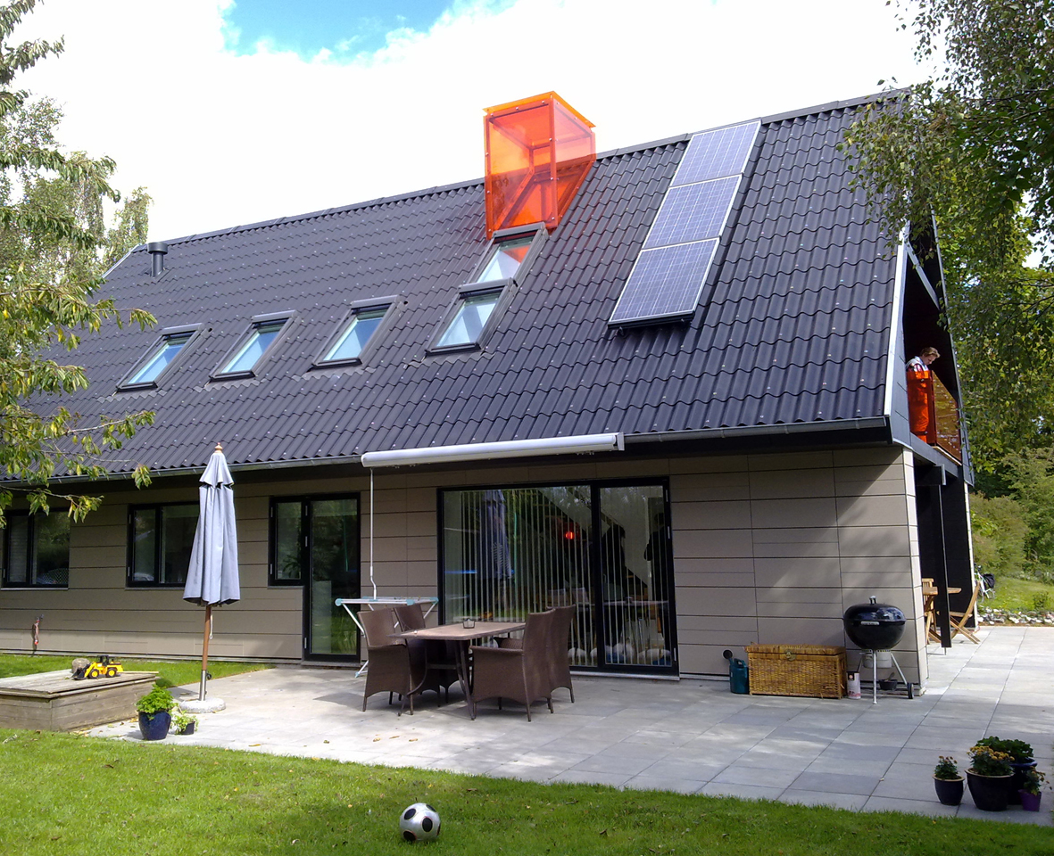 Huset har gennemgået en transformation fra typisk 70’ hus til en tidsvarende lavenergiklasse 2015-bolig, og sammen med en række yderligere el-besparende tiltag, er husets samlede CO2 forbrug reduceret med 75 %.