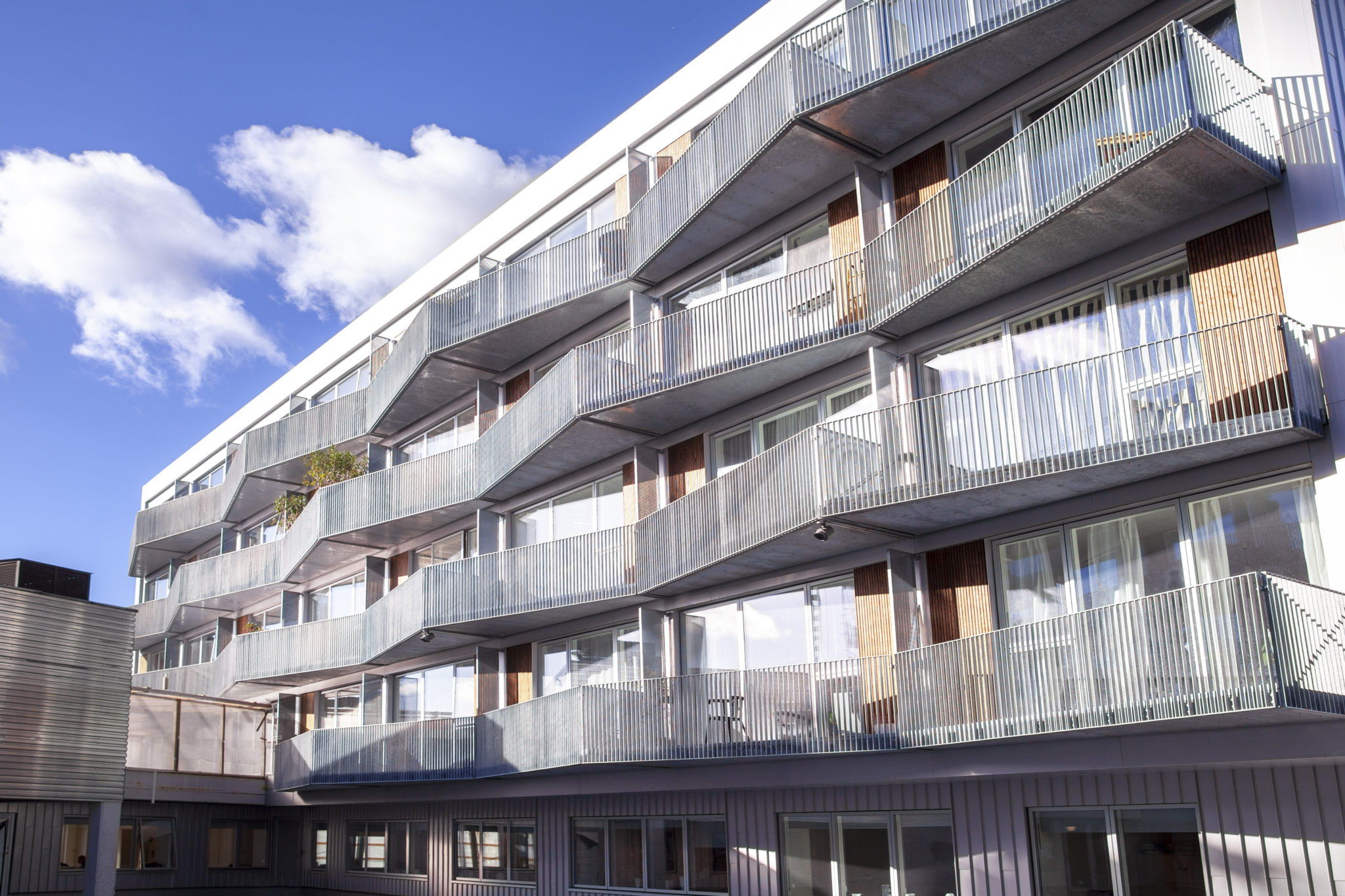 Klimaskærmen og 3-lagsruderne fra Velfac bidrager positivt til bygningens energiperformance. Samtidig tilfører vinduespartiernes smalle rammeprofiler og store glasarealer masser af naturligt dagslys til lejlighederne.