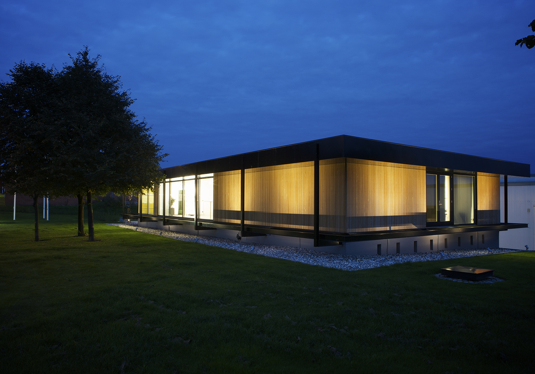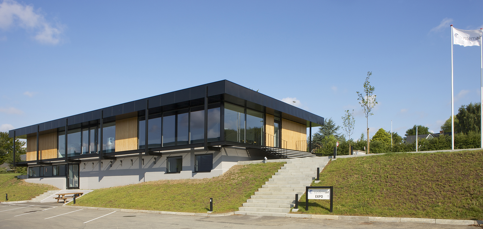 Efter renoveringen har det nye EXPO fået en mere enkel og minimalistisk stil. Udvendig er alle stålkonstruktioner lakeret sorte og bygningens store glaspartier prydes nu af slanke egetræslameller. Bygningens lidt ”svævende” udtryk er bevaret og udendørsarealerne er frisket op. Indvendigt er der installeret et nyt energieffektivt ventilationsanlæg, der via CO2/temperaturfølere regulerer luftmængden og temperaturen efter behov i centrets fire opdelte zoner. De nye rå betongulve behandlet med epoxy giver en industrielt look til lokalerne og spiller godt sammen med den store udstilling af ventilationsprodukter. Troldtekt-lofter forbedrer akustikken og alt inventar er udskiftet, heriblandt et nyt køkken udført i egetræ, således at det nu er et topmoderne udstillings- og kundecenter med førsteklasses-faciliteter for Systemairs kunder og samarbejdspartnere i mange år fremover.