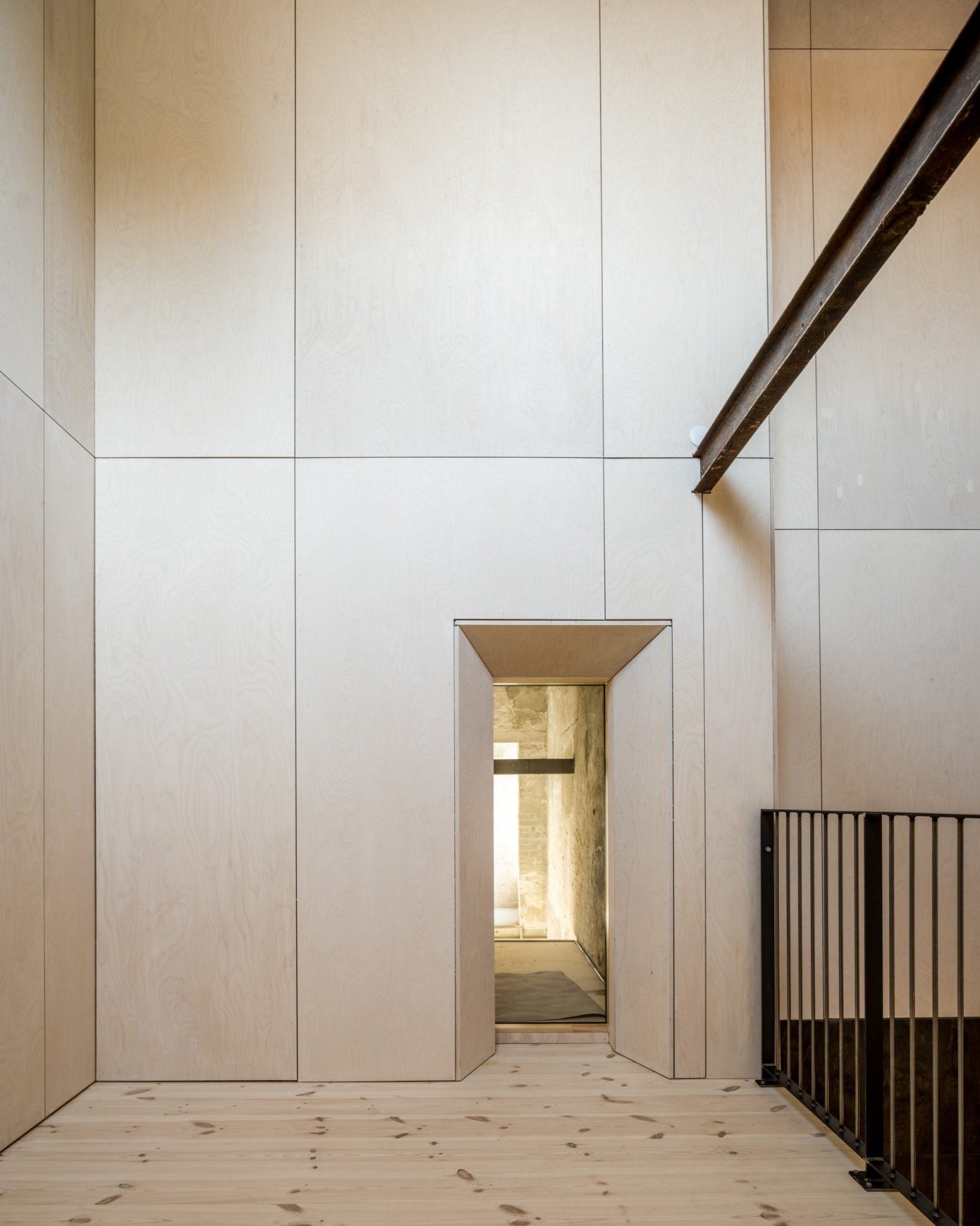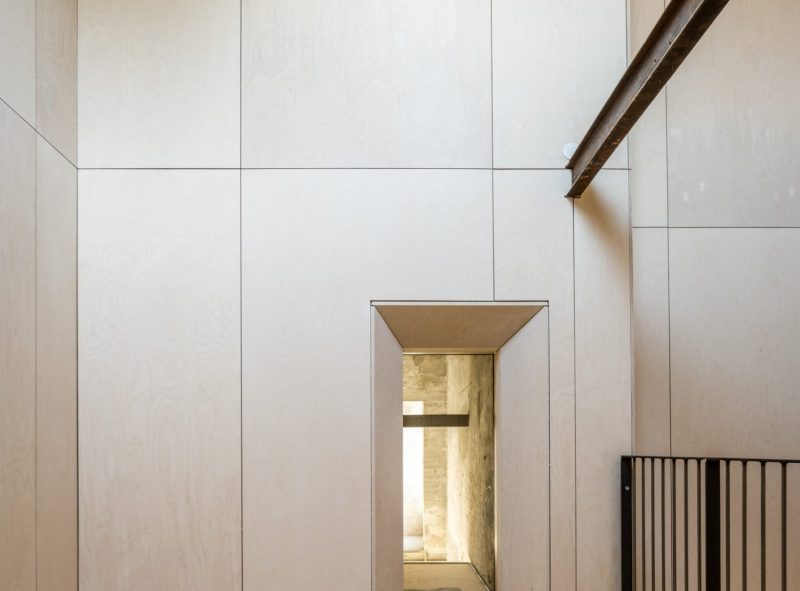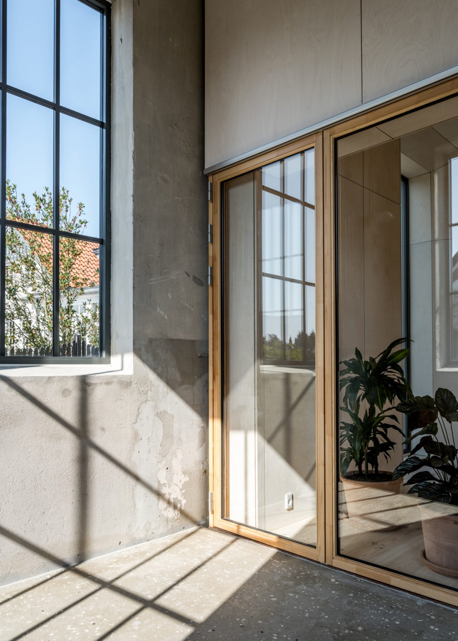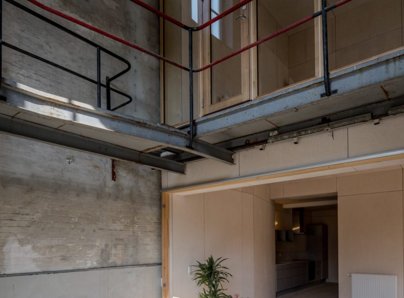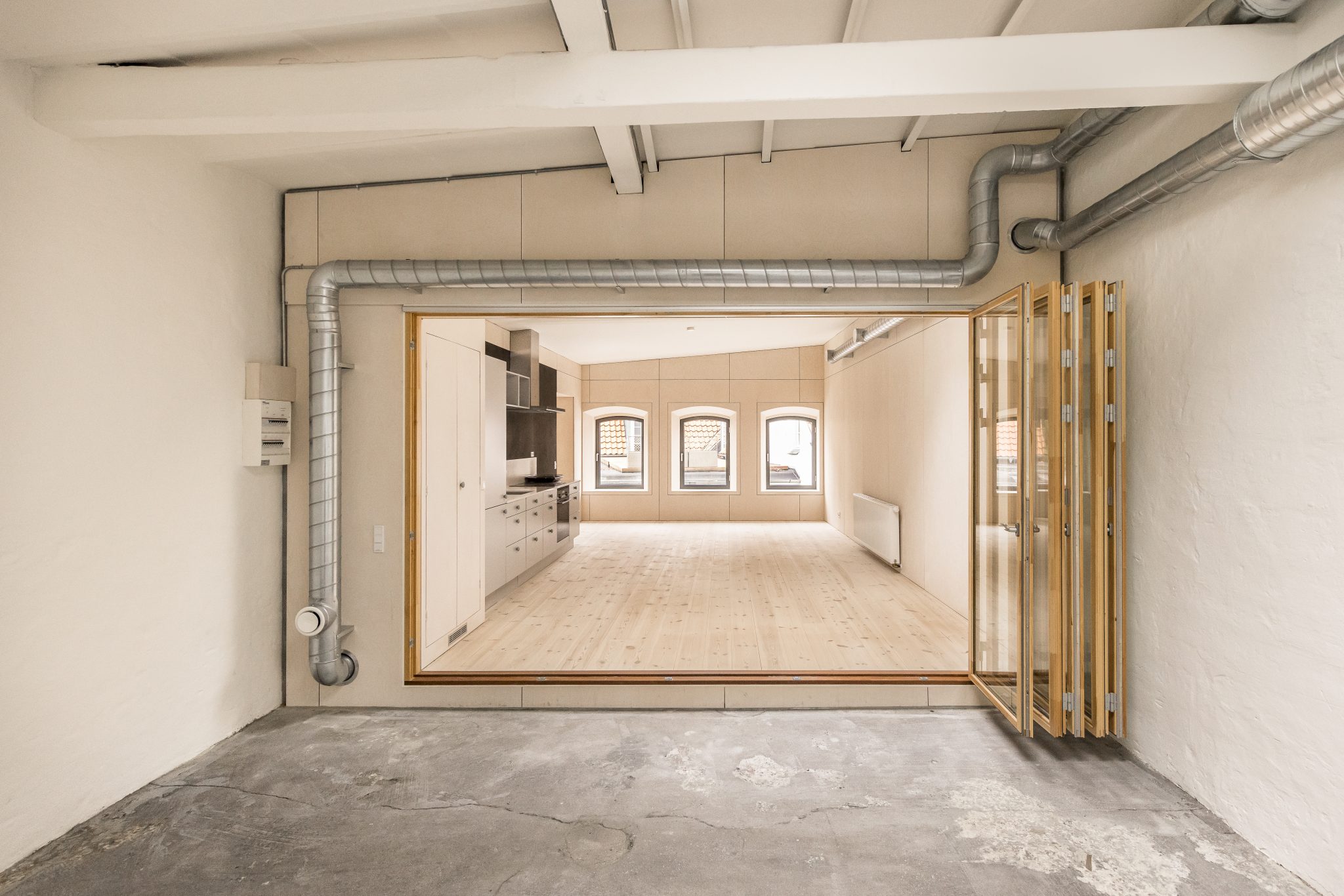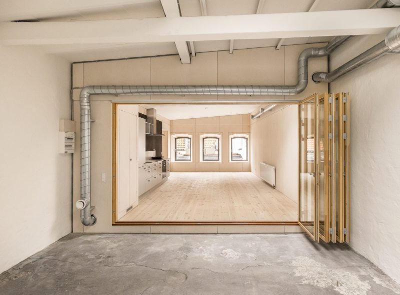 Væggen mellem den nye konstruktion og den eksisterende bygning er opbygget af glaspartier som kan åbnes helt op. Det gør at overgangen, i de fleste af årets måneder, er flydende, og man oplever boligen som stor og fleksibel. I årets kolde måneder kan der lukkes af, men den visuelle kontakt bevares. Det er særligt mødet mellem det rå uopvarmede rum og den nye kerne som formidler bygningskulturarven. Her sættes de originale overflader med tydelige brugsspor og loftets romerdæk, i kontrast til de nye trækonstruktioner, og der opstår et spændingsfelt som gør boligerne til noget særligt. De fortæller om stedets historie, samtidig med at de skaber rammen om noget nyt.
