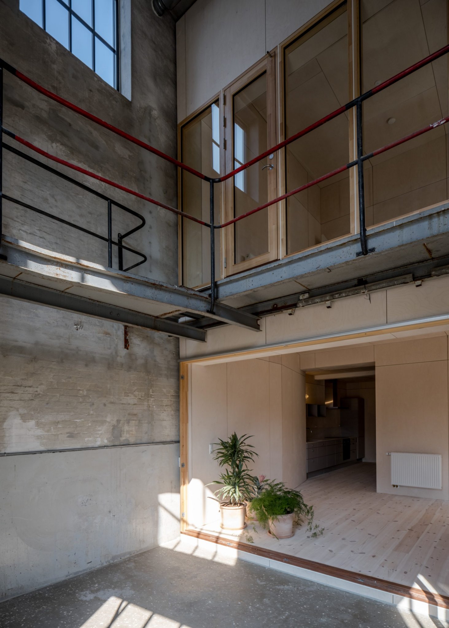 I stedet for at renovere alle kvadratmeter og overflader lades store dele af den gamle fabrik stå som den er. Kun de bygningsdele som er i kritisk stand i forhold til bygningens levetid renoveres. Inde i de rå fabriksrum bygges en selvstændig trækonstruktion – fri af den eksisterende konstruktion. Vi kalder trækonstruktion for kernen og den eksisterende bygning for skallen. Hver bolig består af en kerne og en skal.