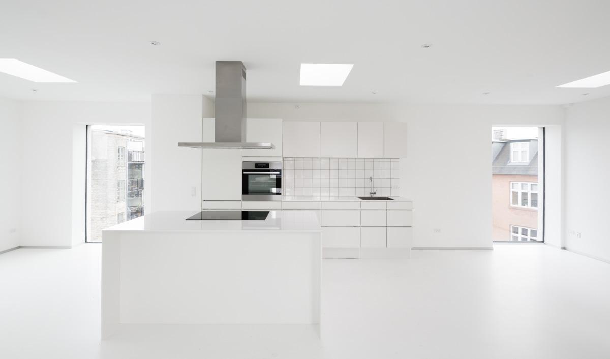 De nyindrettede lejligheder er disponeret, så man har en åben rumfornemmelse, hvor værelserne fremstår som underordnede volumener på en lys og sammenhængende gulvflade. I de oprindeligt lukkede facadepartier i husets bagside er der udført nye vinduesudskæringer med glas til gulv, så de tidligere ensidigt belyste rum får lys fra flere sider. Vinduesudskæringerne giver samtidig husets bagside en markant æstetisk og mere levende karakter.
