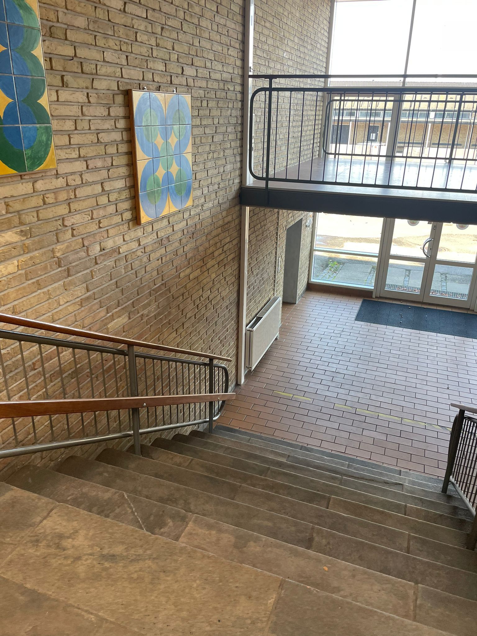 Trappebelægning og gelændere. Det lykkedes nedbrydningsfirmaet at sikre så mange skifferplader fra tre trapper på den gamle skole, at der kunne laves en nærmest 1:1 trappe af den gamle hovedtrappe til 1. sal i FÆLLESHUSETs hovedindgangen. Illusionen er fuldendt ved anvendelse af de gamle gelændere og mahognihåndlister.