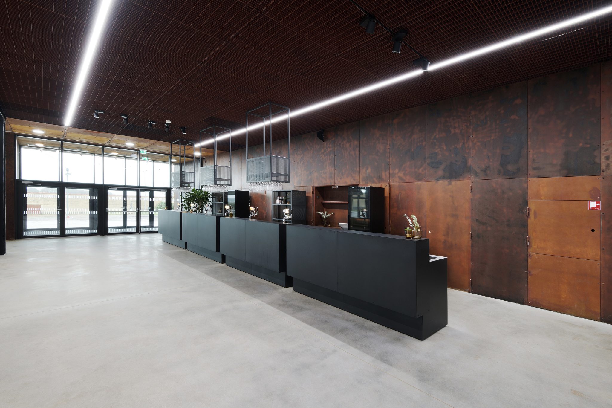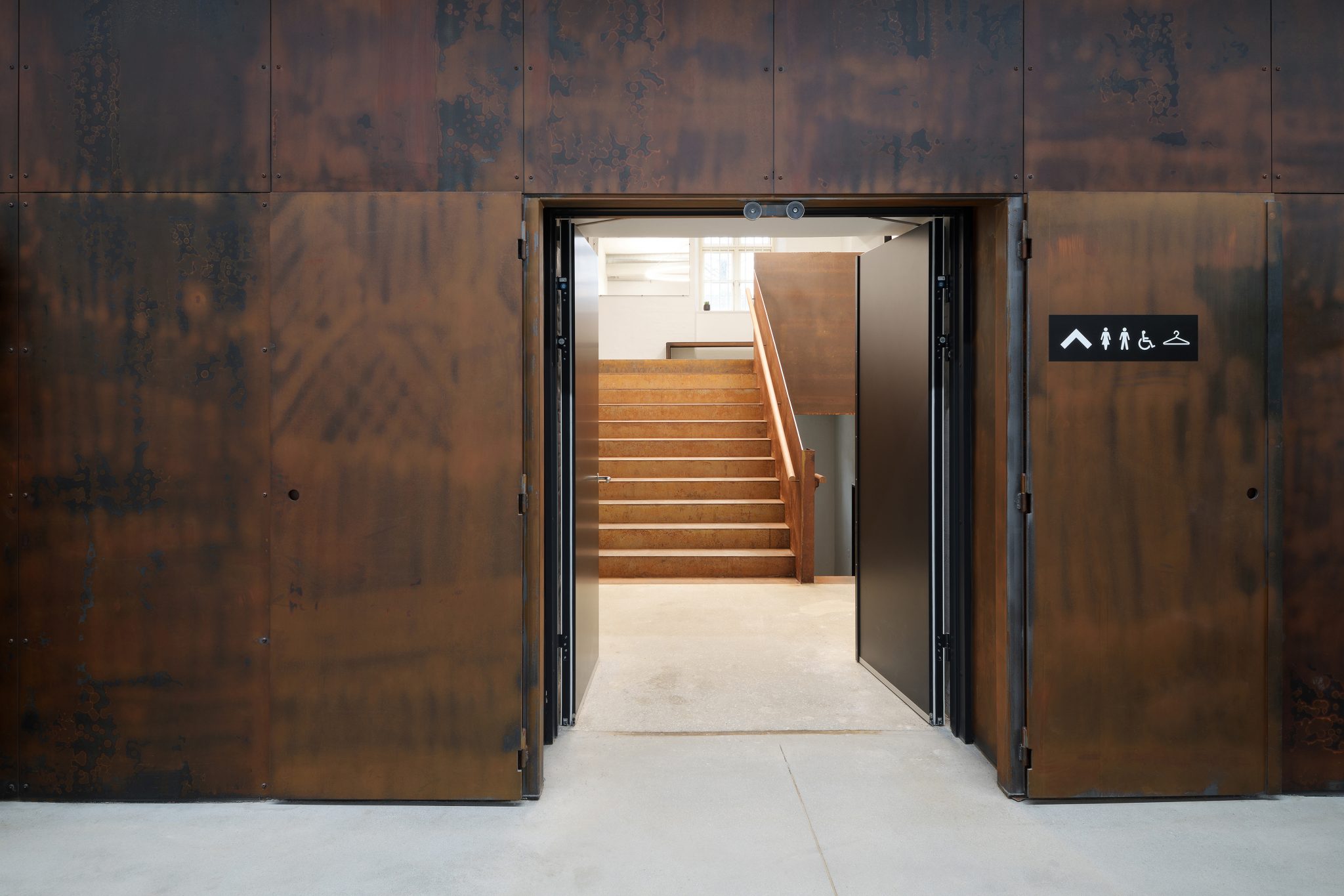 Stålportene indgår desuden i de forskellige fleksible løsninger, både som døre i facaden vod vest og som hæve- sænke porte mod gårdrummet. Portene er indvendigt beklædt i forpatineret stål. I den øvrige ’foring’ dannes loftsfladen glat fra udhæng og ind til gårdrummet, kun brudt af de store markante stålkonstruktioner. For at integrere de akustiske løsninger beklædes loftet i Lille og Store Sal med stålriste, hvilket også er anvendt på hejseportene mod Indergården af samme grund.