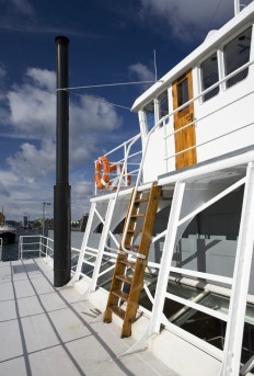 Tagkonstruktionen er friholdt færgens sidebygninger med glasbånd. Motorrummet er ryddet og motorlemmen fjernet hvilket giver lys under dæk.