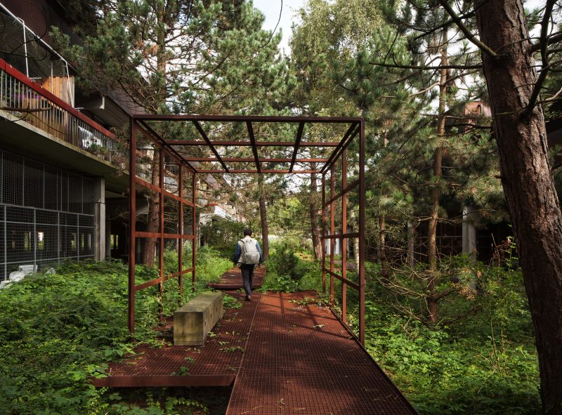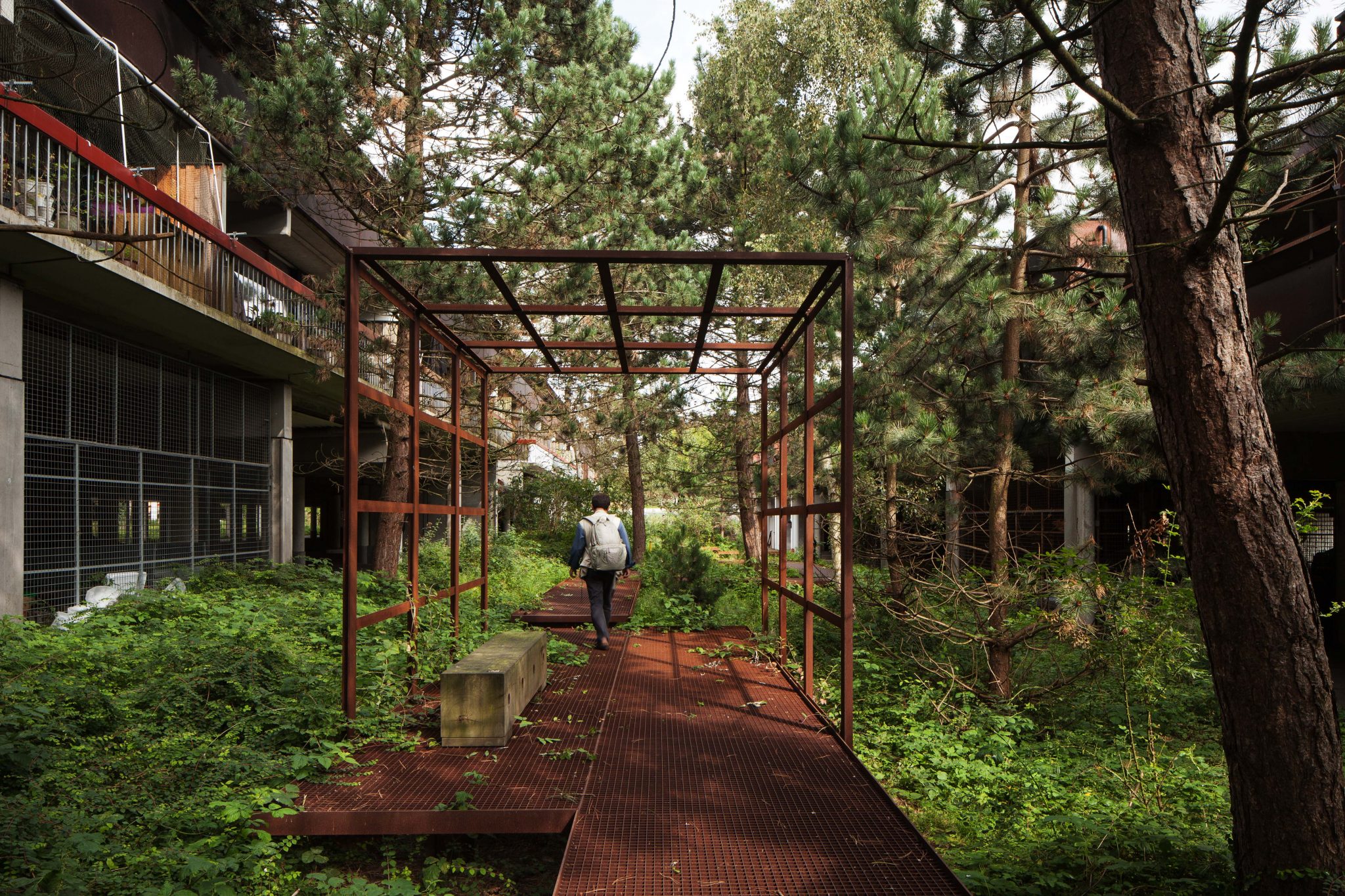 Den unikke modernistiske arkitektur med beton og cortenstål har været spejlet og anvendt i omdannelse af eksisterende blokke til plejecenteret, samt nye tiltag i udearealerne, så fusionen mellem eksisterende og nyt skaber en begavet arkitektonisk synergi.