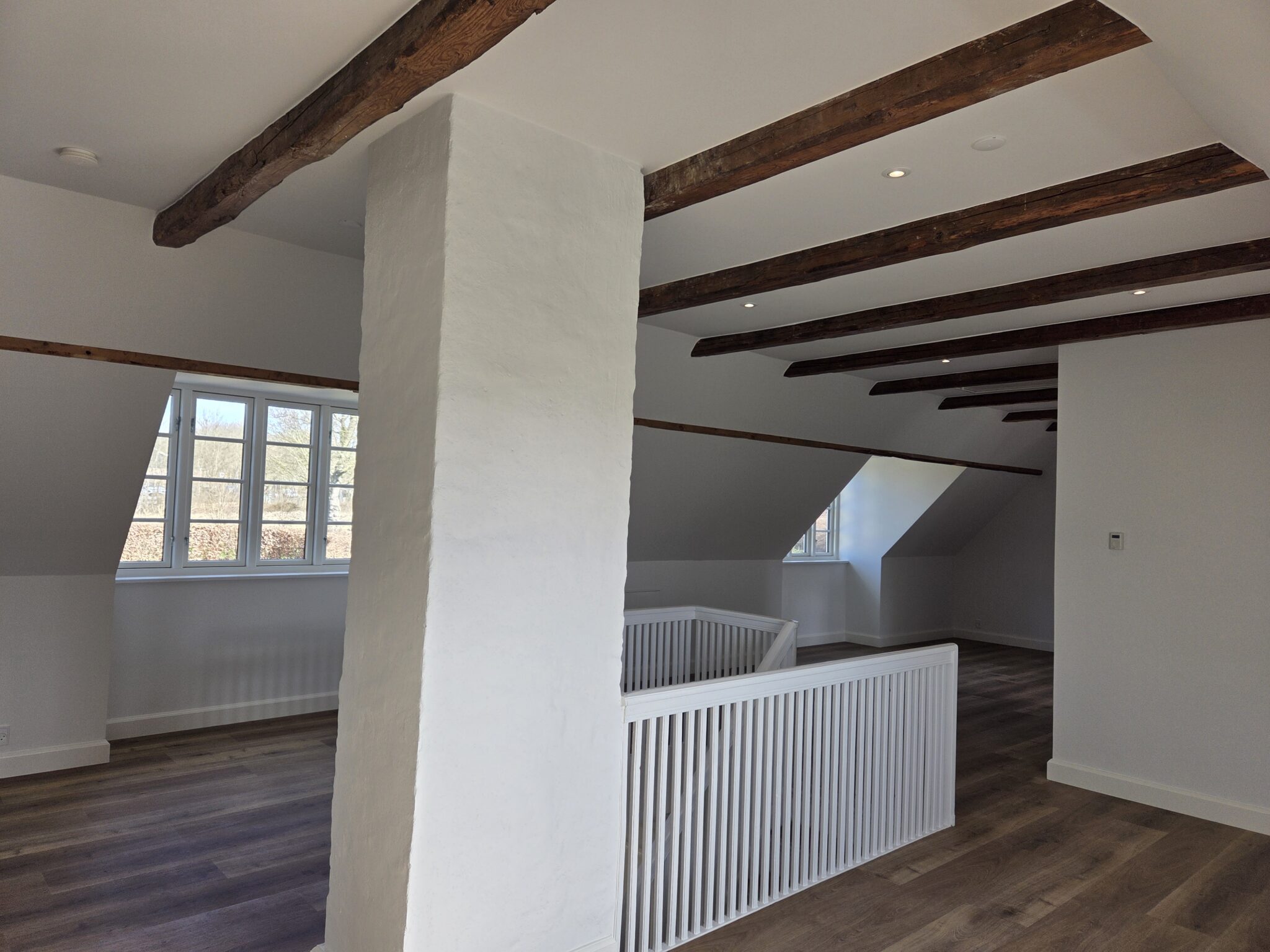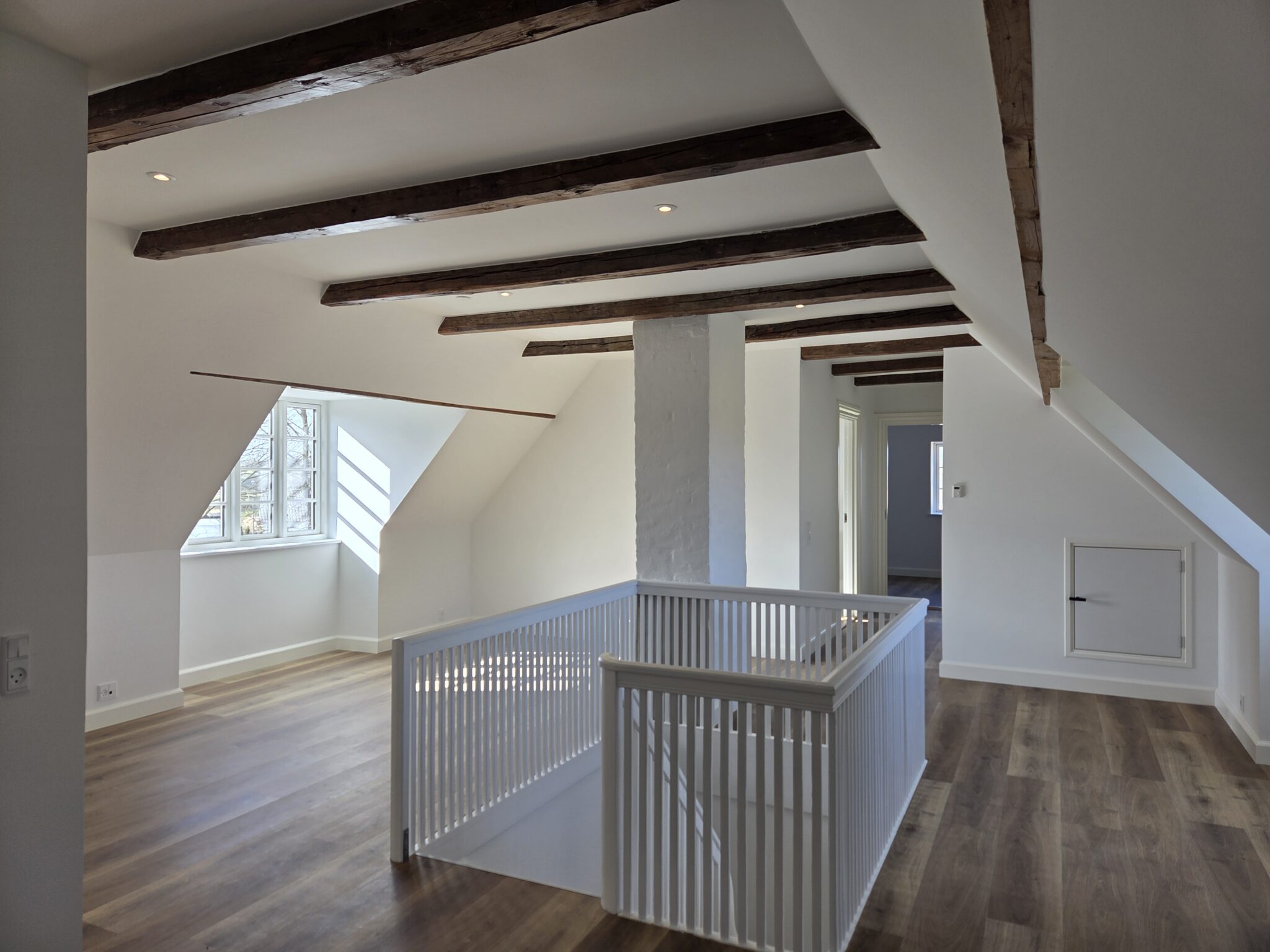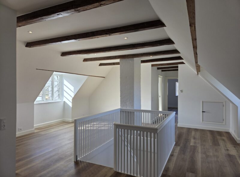 Renoveringen har givet en markant bedre udnyttelse af 1 sal, som tidligere var mørk og mindre anvendelig. De nye kviste tilfører generøse mængder dagslys og skaber sunde, lyse rum med et forbedret indeklima og langt større funktionel værdi i hverdagen. Overetagen kan nu bruges fuldt ud til bolig og ophold, hvilket giver præsten mere tidssvarende og velfungerende rammer.