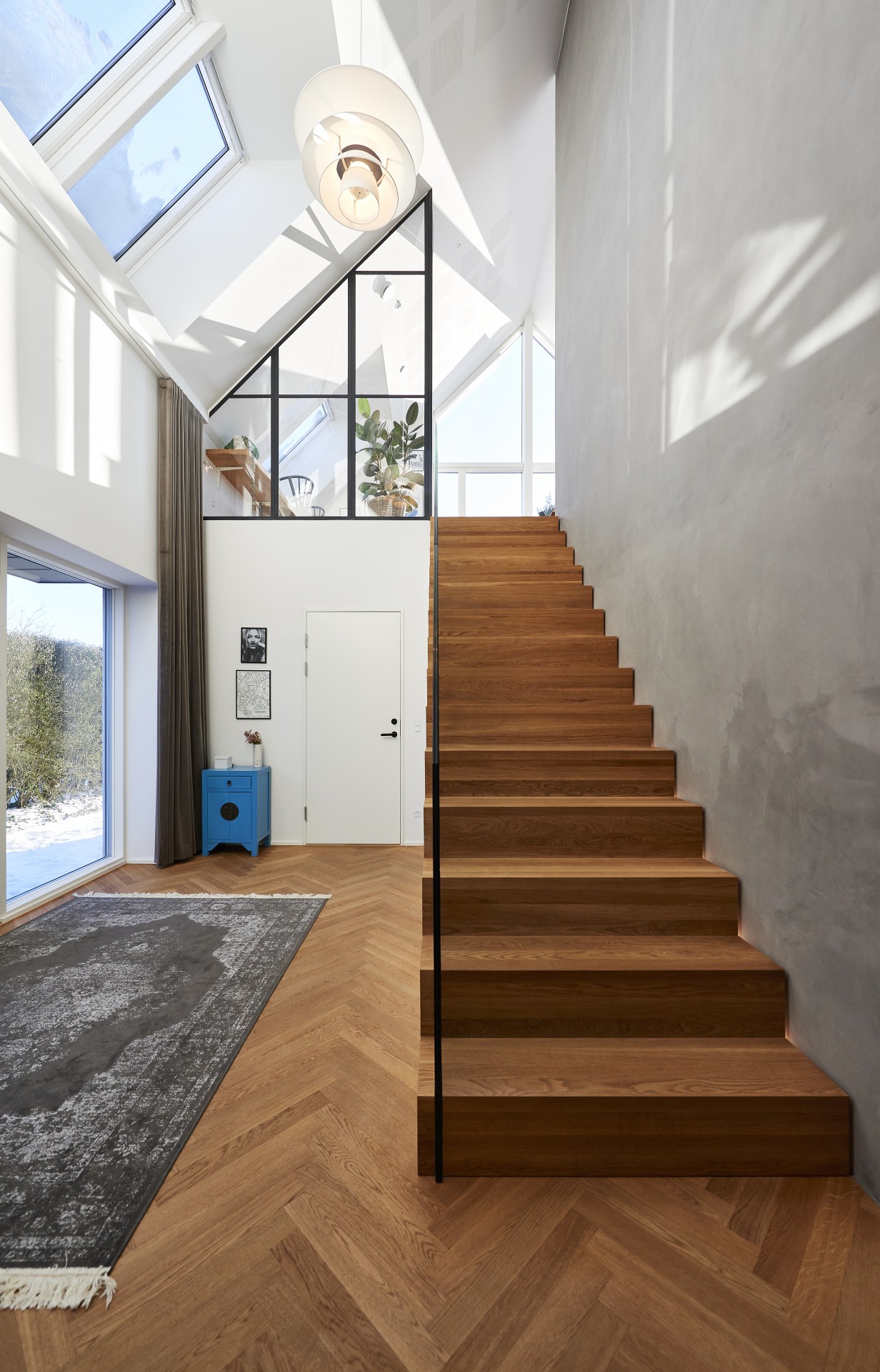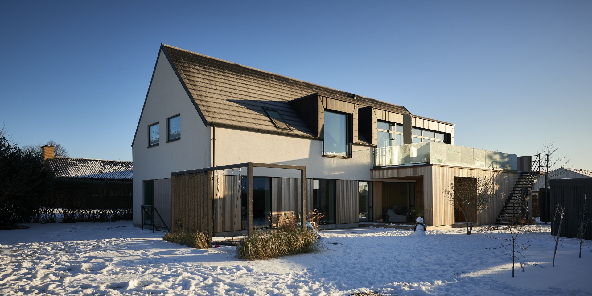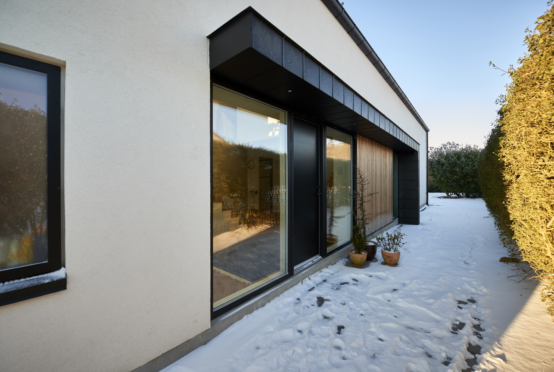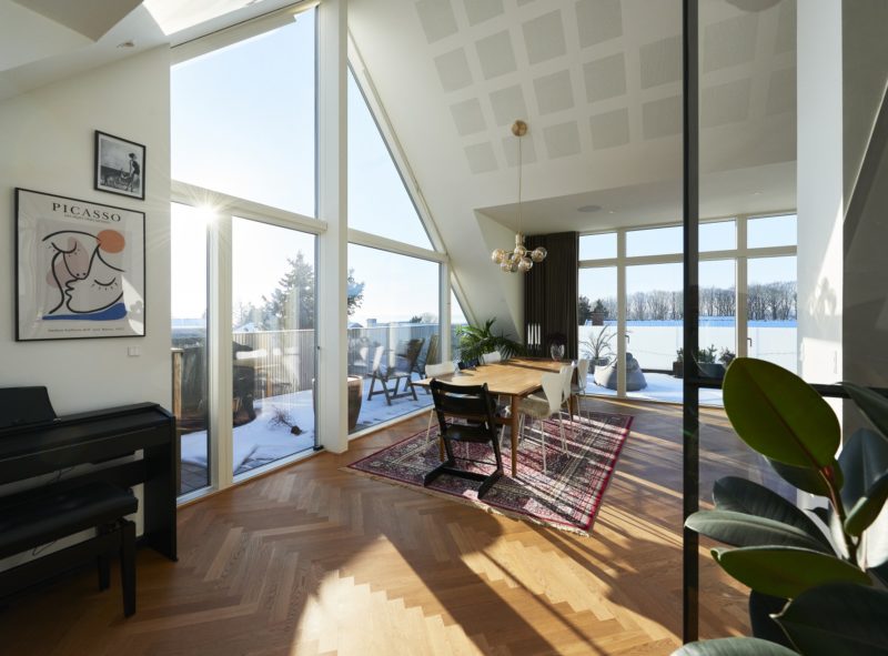 De store glaspartier har indbyggede solfilterglas og screens for udvendig solafskærmning.