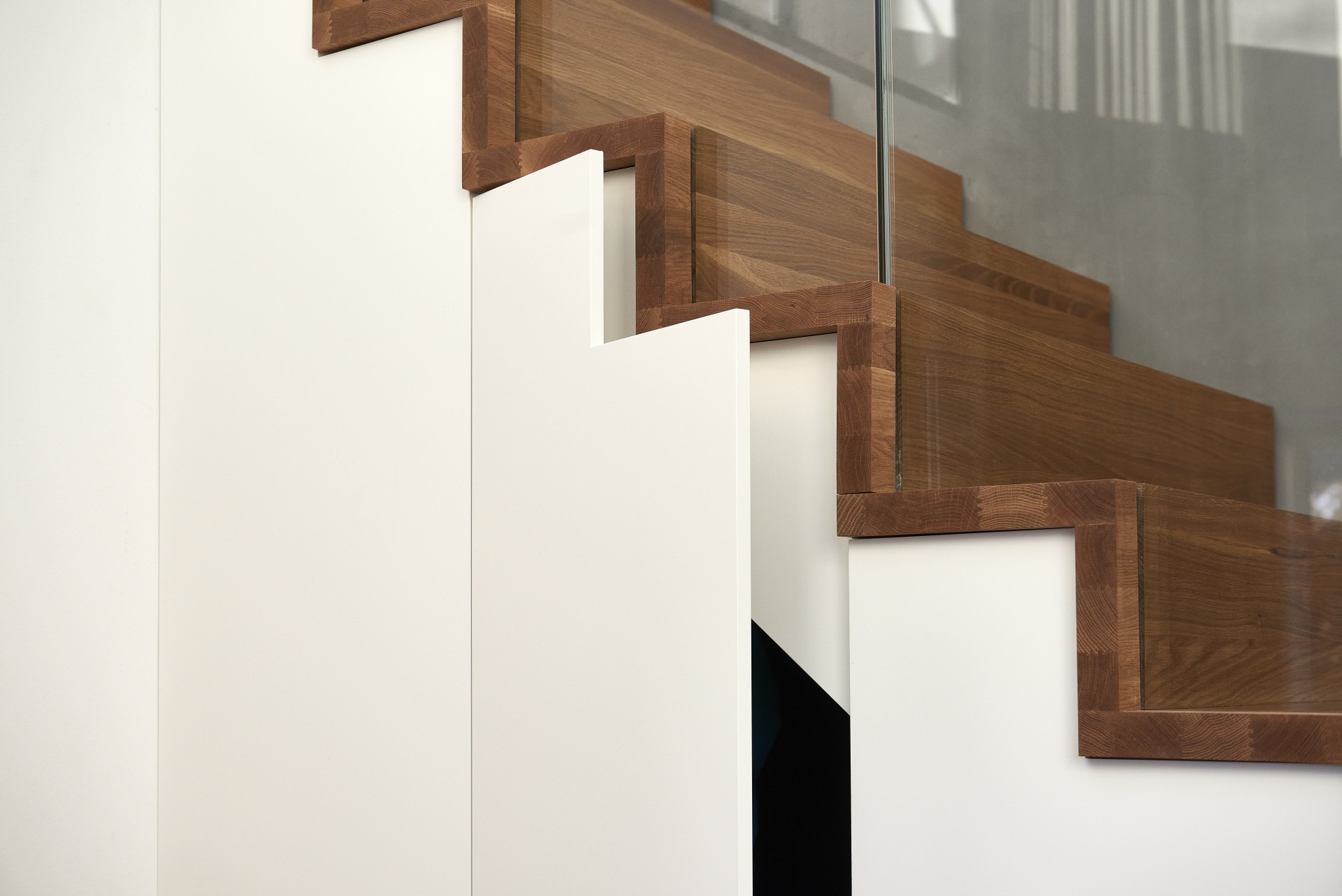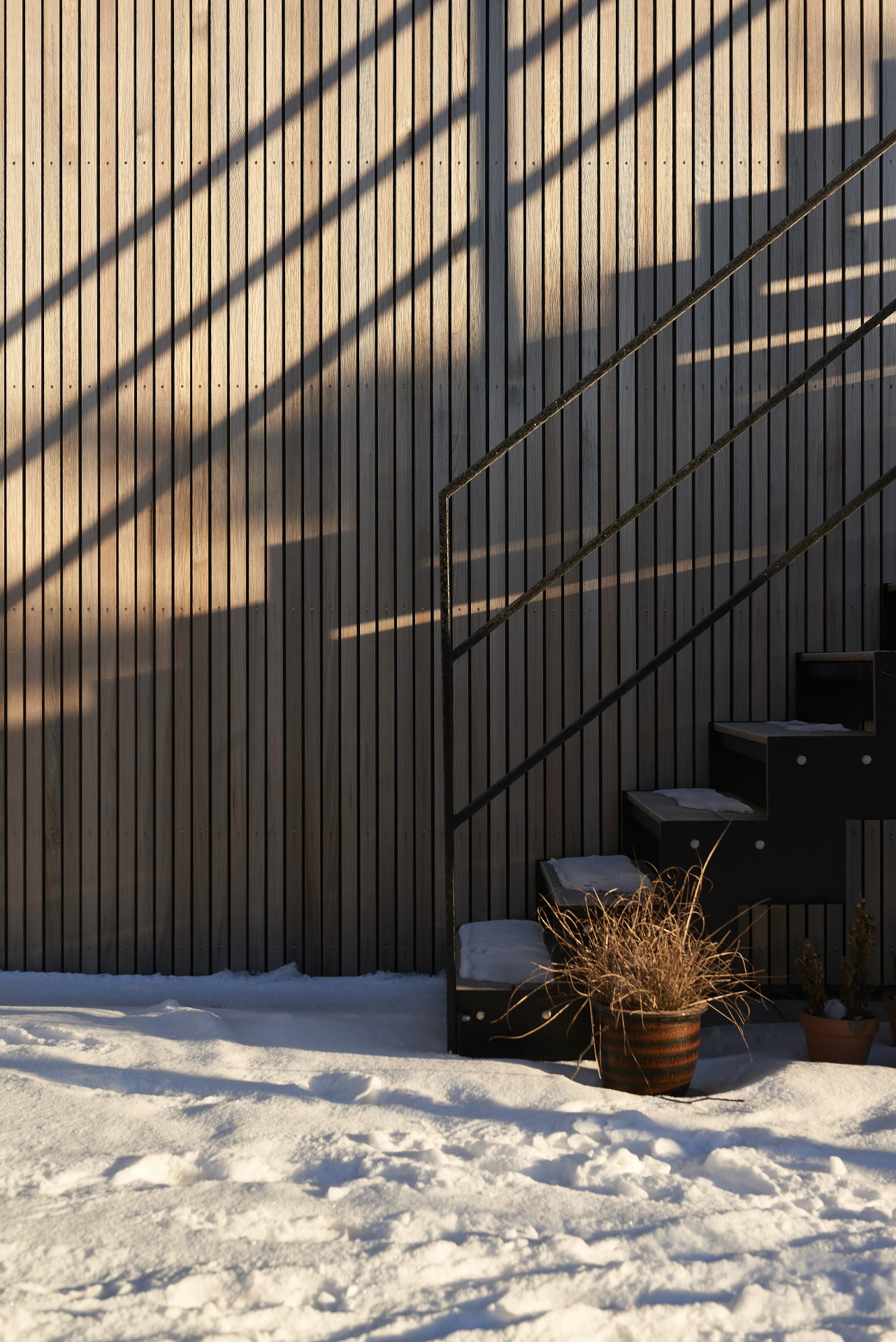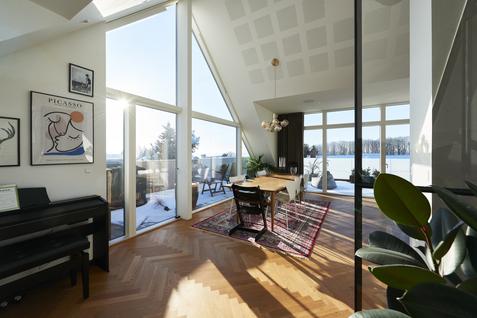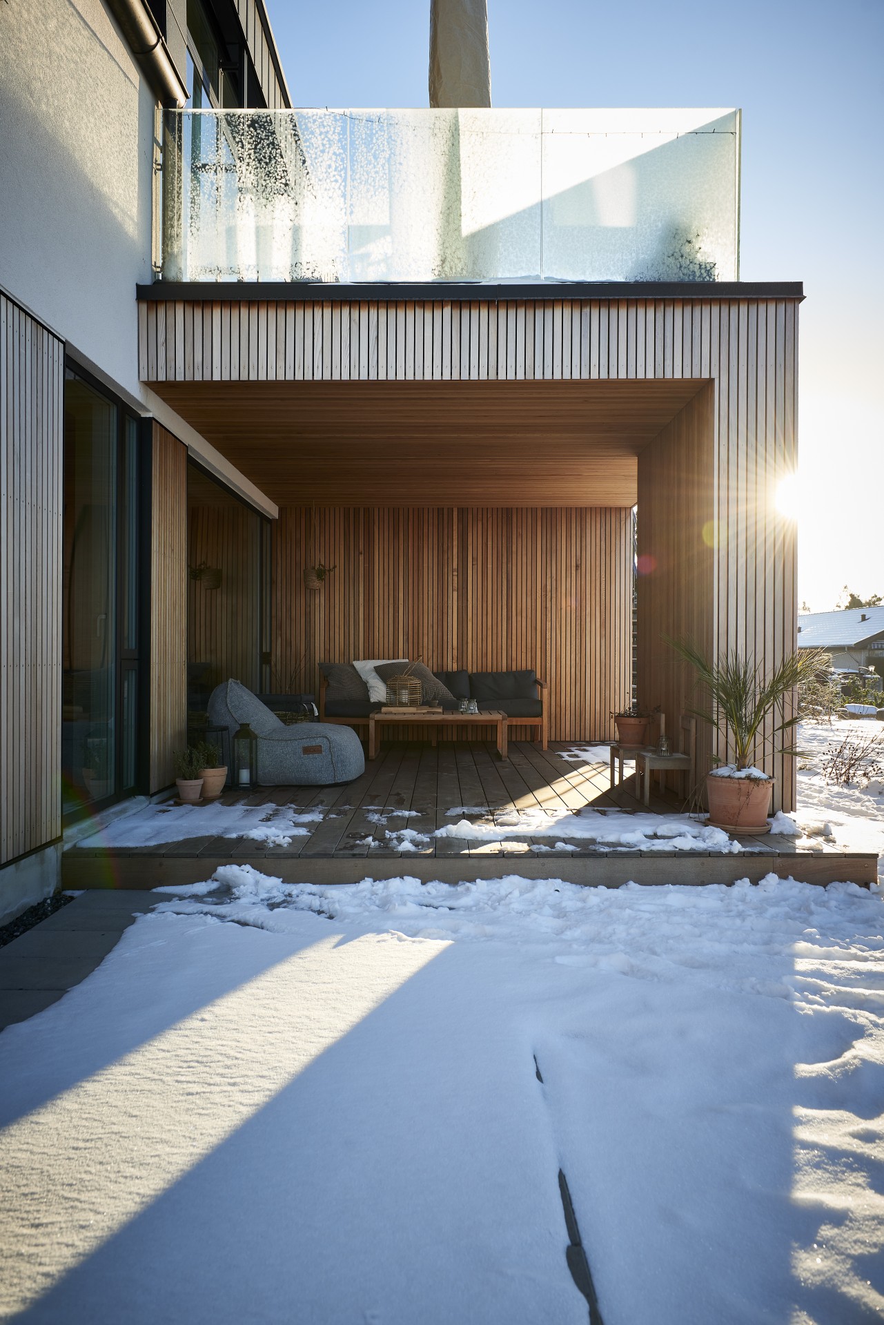 De store glaspartier har indbyggede solfilterglas og screens for udvendig solafskærmning.
