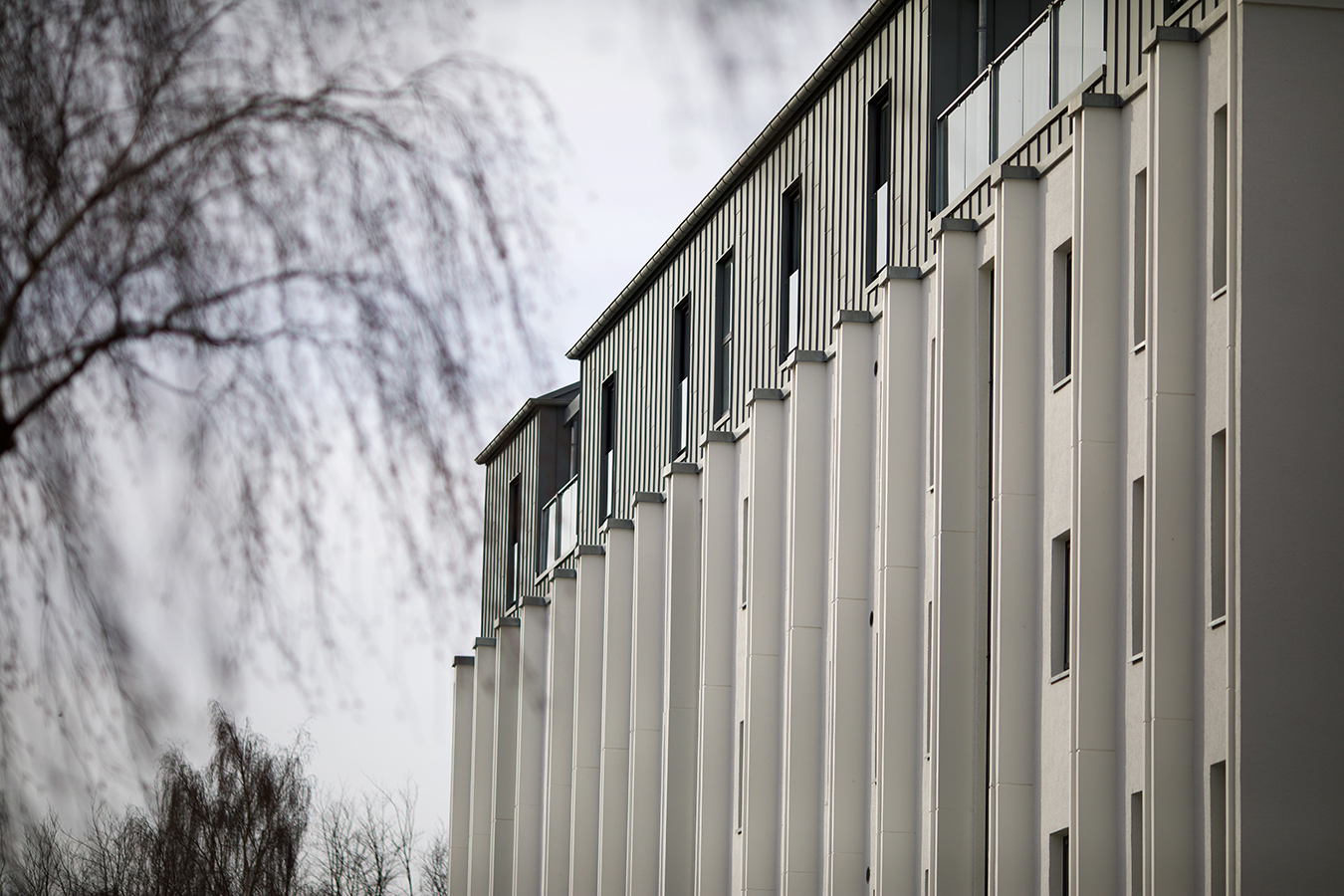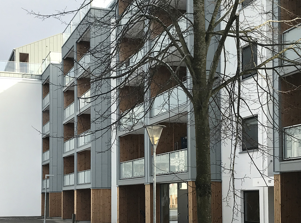 Beboerne i afd. 21 Ryde- og Fjældevænget er stolte af deres ’nye’ afdeling. Før var det hele trist og gråhvidt, nu er der et smukt samspil mellem de forskellige materialer: lyse betonflader, træforede altaner og aluplader, som indrammer altanpartier og bruges som beklædning på den nye penthouseetage.